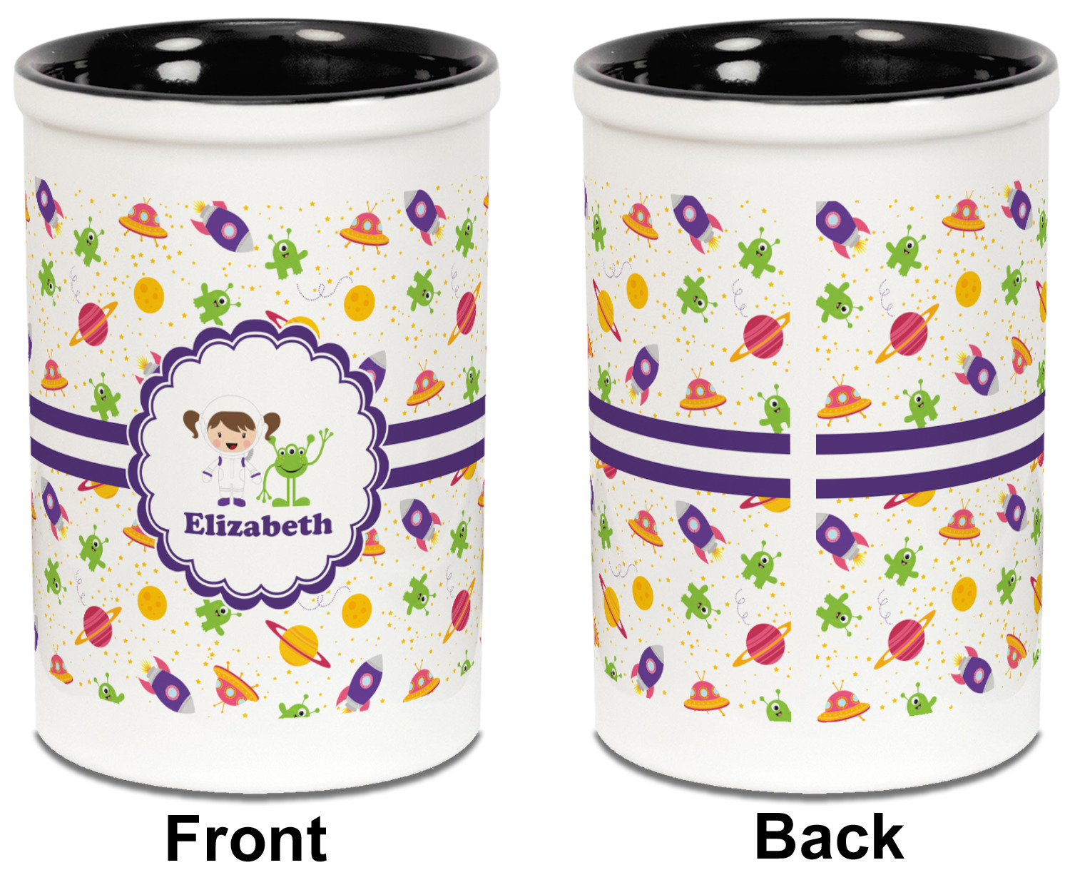 Explore another galaxy with this whimsical space design. Fun colors of yellow, pink, purple, and green make this design of space exploration come alive. The design is full of little green martians, purple and pink spaceships, yellow and pink planets, and yellow stars galore.