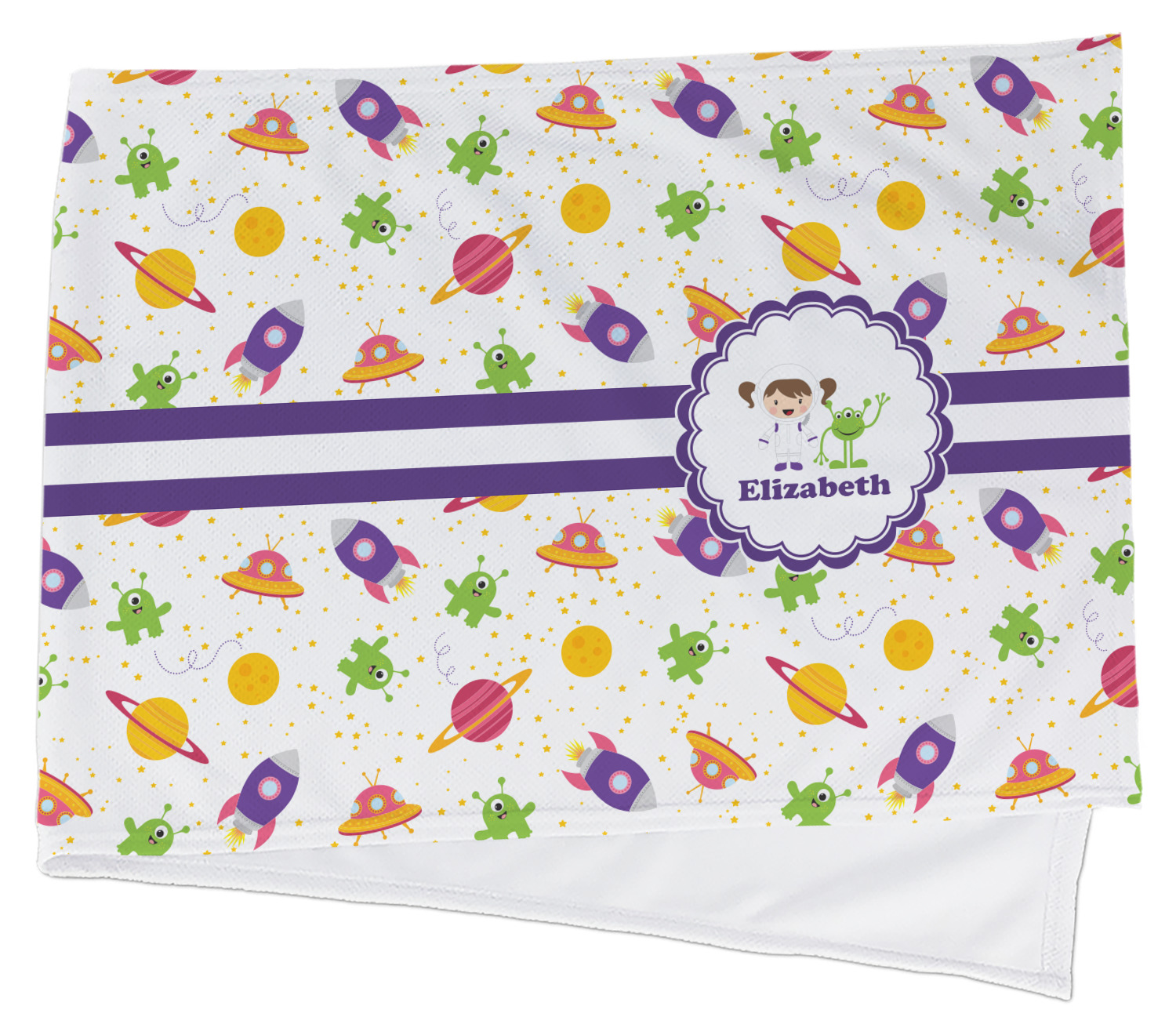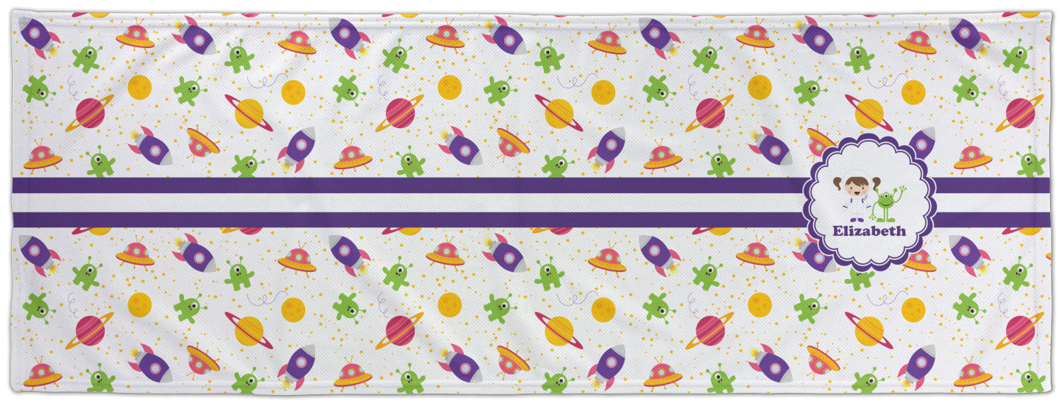 Explore another galaxy with this whimsical space design. Fun colors of yellow, pink, purple, and green make this design of space exploration come alive. The design is full of little green martians, purple and pink spaceships, yellow and pink planets, and yellow stars galore.