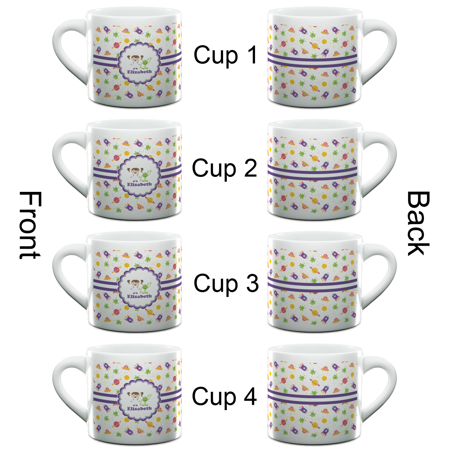 Each of our espresso mugs is a ceramic material sure to keep your drink warm. Personalize one cup for yourself, or order a set of 4! Its the perfect little gift for any coffee lover! We carry two sizes for you to personalize - 3 oz. (approx. 3.25" x 2.325" x 2.625") or 6 oz. (approx. 4" x 2.9" x 2.9"). Our 3 oz. mug is perfect for that single shot espresso while our 6 oz. mug can be your next favorite cappuccino cup holding two shots of espresso!