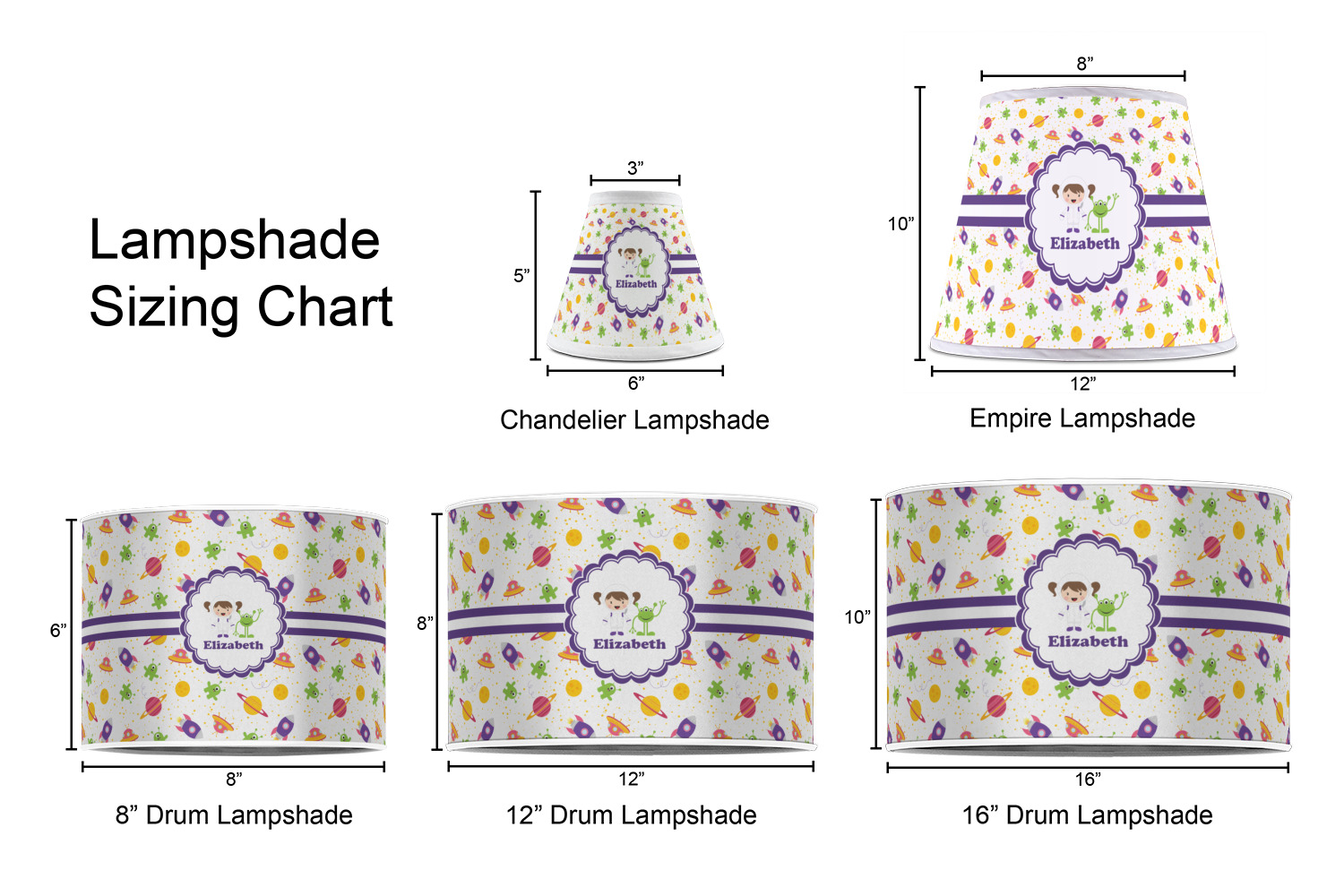 Our customized lamp shades also come in 3 different sizes: 8", 12" and 16", measuring at 8" in diameter by 6" tall, 12" in diameter by 8" tall, and 16" in diameter by 10" tall, respectively.