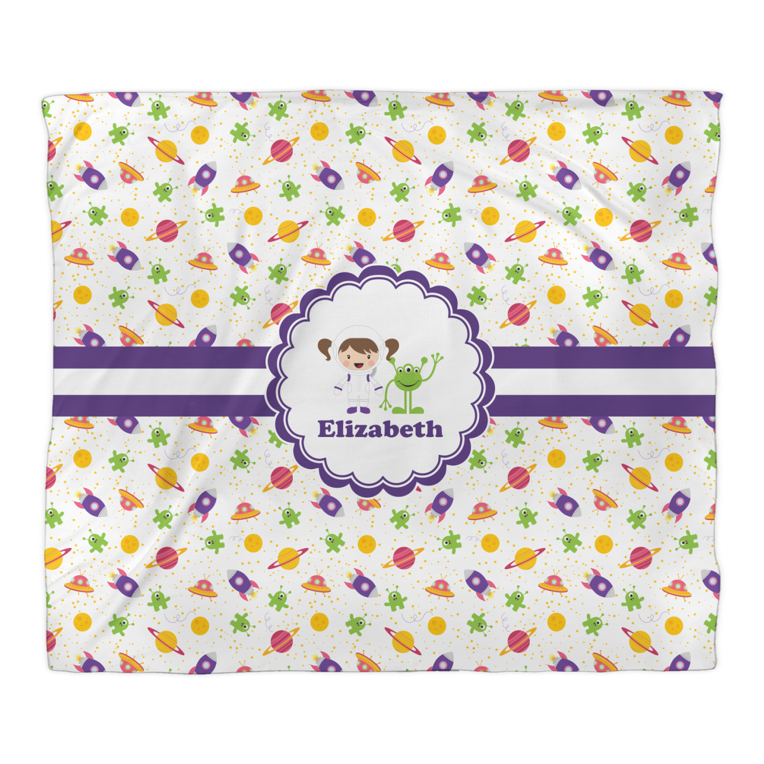 Explore another galaxy with this whimsical space design. Fun colors of yellow, pink, purple, and green make this design of space exploration come alive. The design is full of little green martians, purple and pink spaceships, yellow and pink planets, and yellow stars galore.