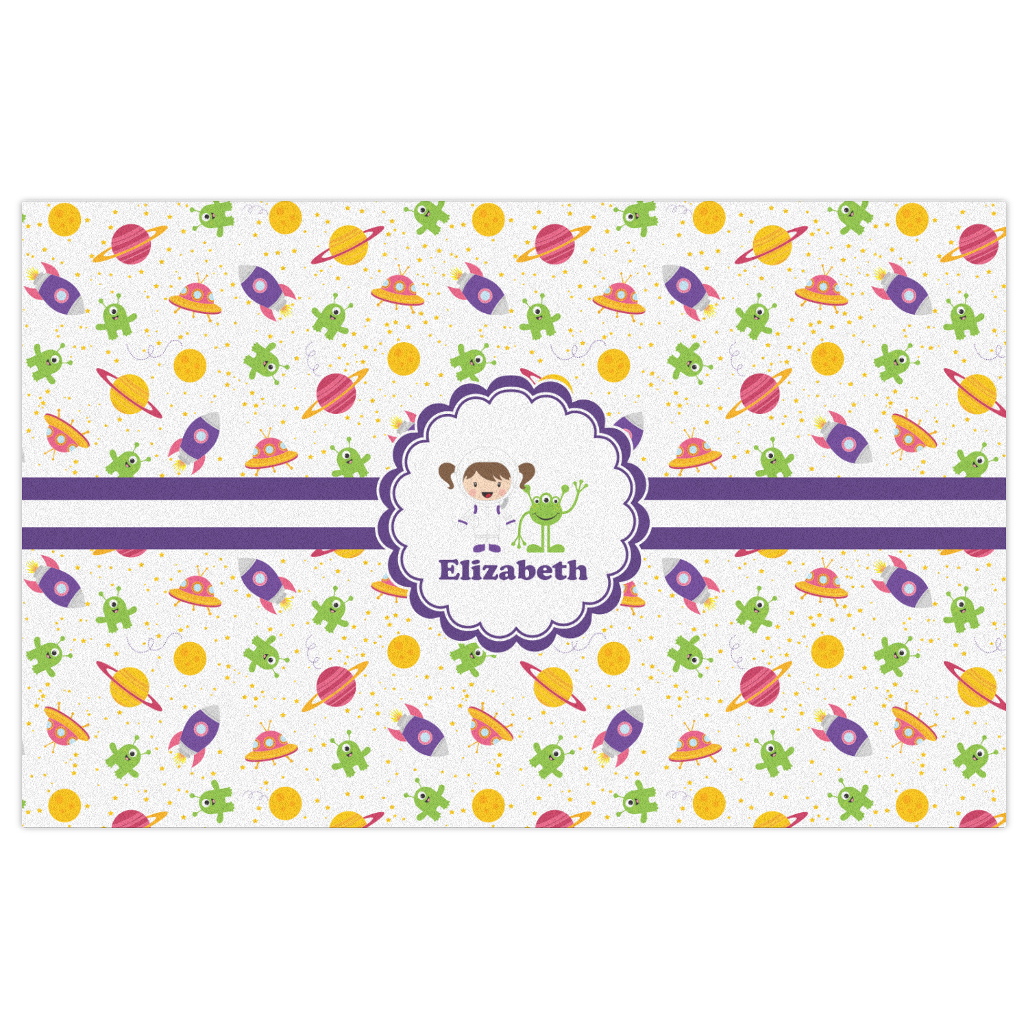 Explore another galaxy with this whimsical space design. Fun colors of yellow, pink, purple, and green make this design of space exploration come alive. The design is full of little green martians, purple and pink spaceships, yellow and pink planets, and yellow stars galore.