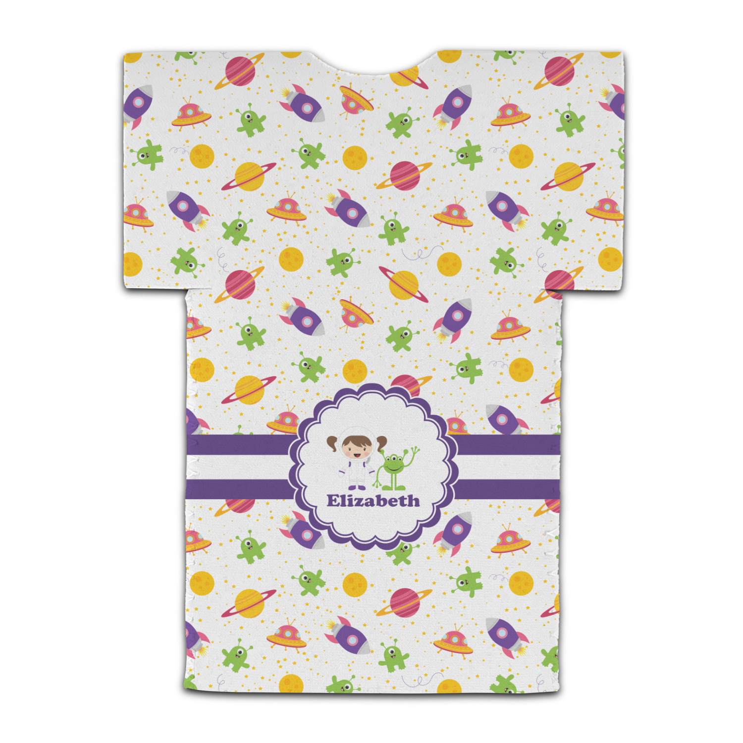 Explore another galaxy with this whimsical space design. Fun colors of yellow, pink, purple, and green make this design of space exploration come alive. The design is full of little green martians, purple and pink spaceships, yellow and pink planets, and yellow stars galore.