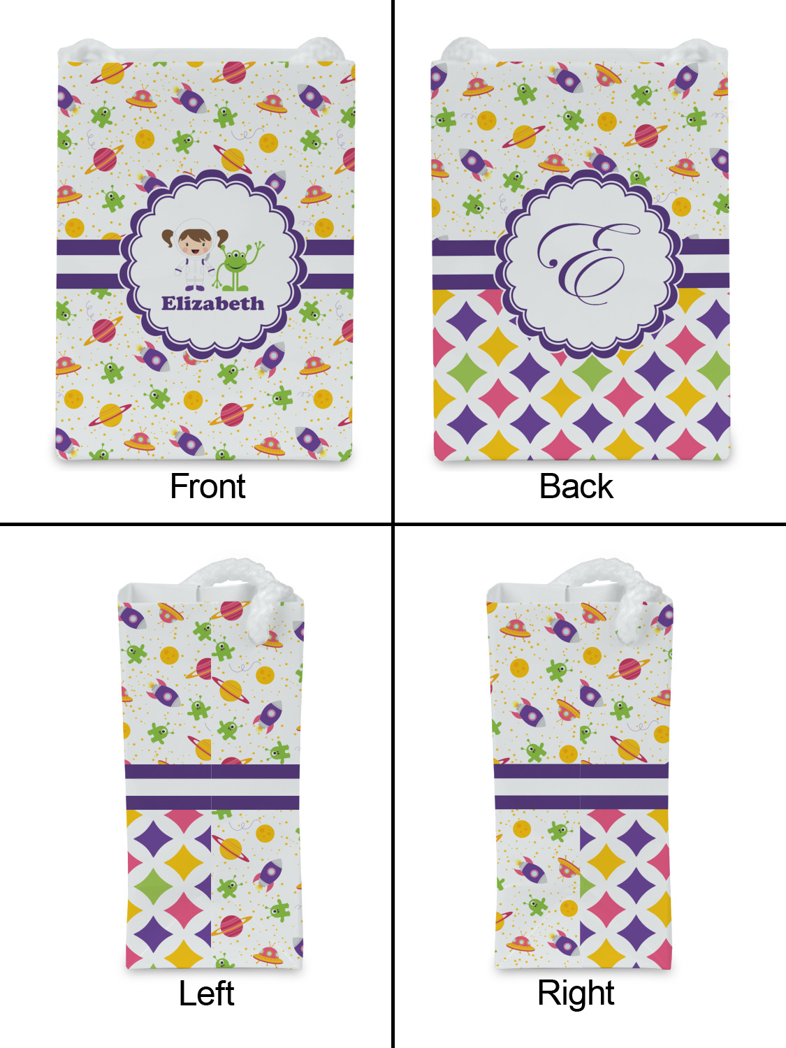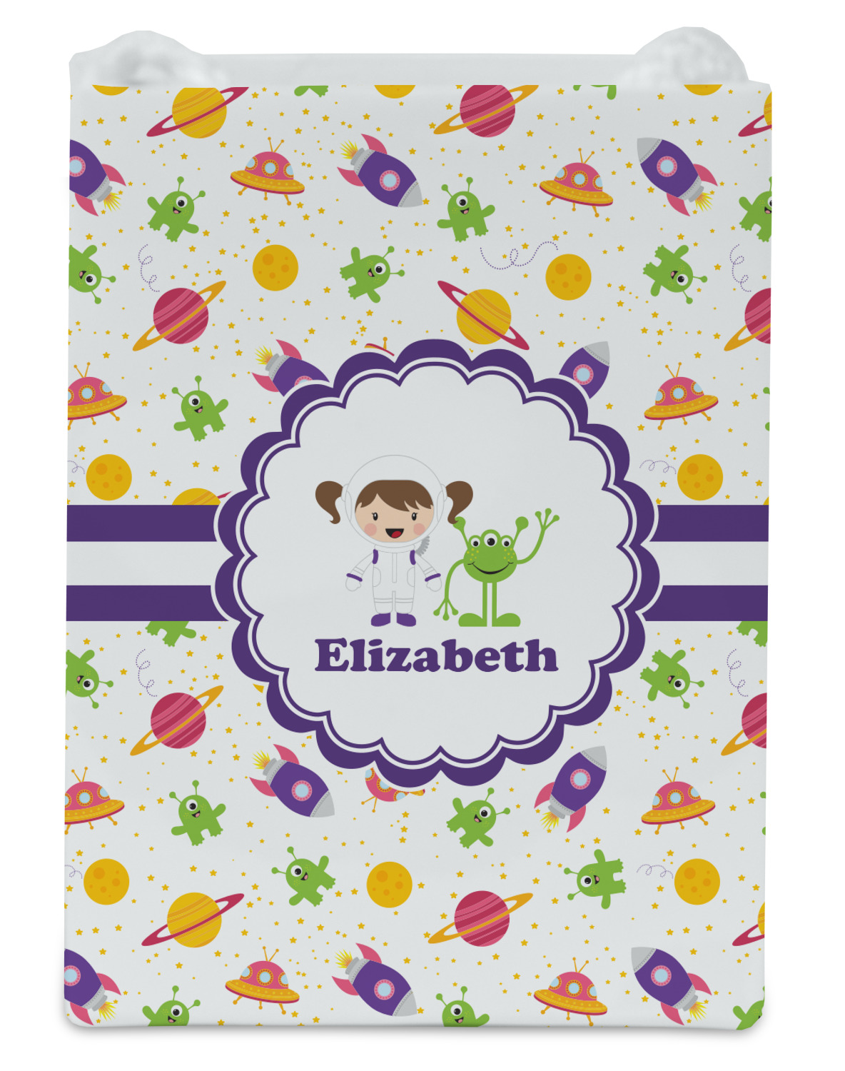 Explore another galaxy with this whimsical space design. Fun colors of yellow, pink, purple, and green make this design of space exploration come alive. The design is full of little green martians, purple and pink spaceships, yellow and pink planets, and yellow stars galore.