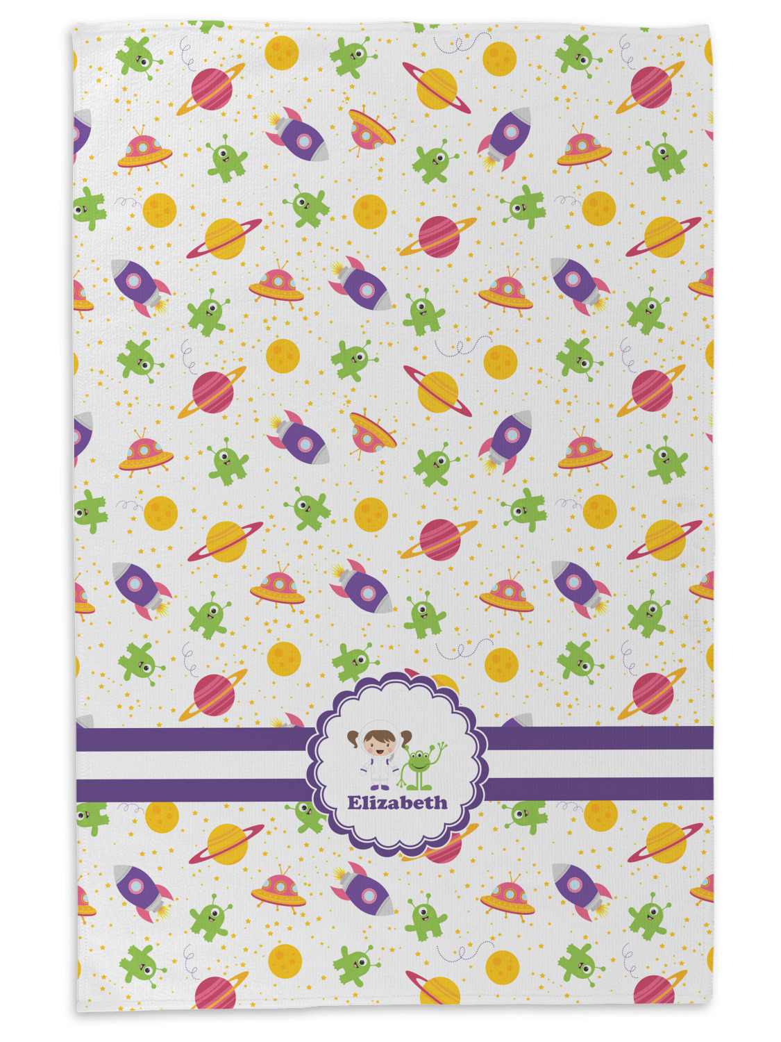 Explore another galaxy with this whimsical space design. Fun colors of yellow, pink, purple, and green make this design of space exploration come alive. The design is full of little green martians, purple and pink spaceships, yellow and pink planets, and yellow stars galore.