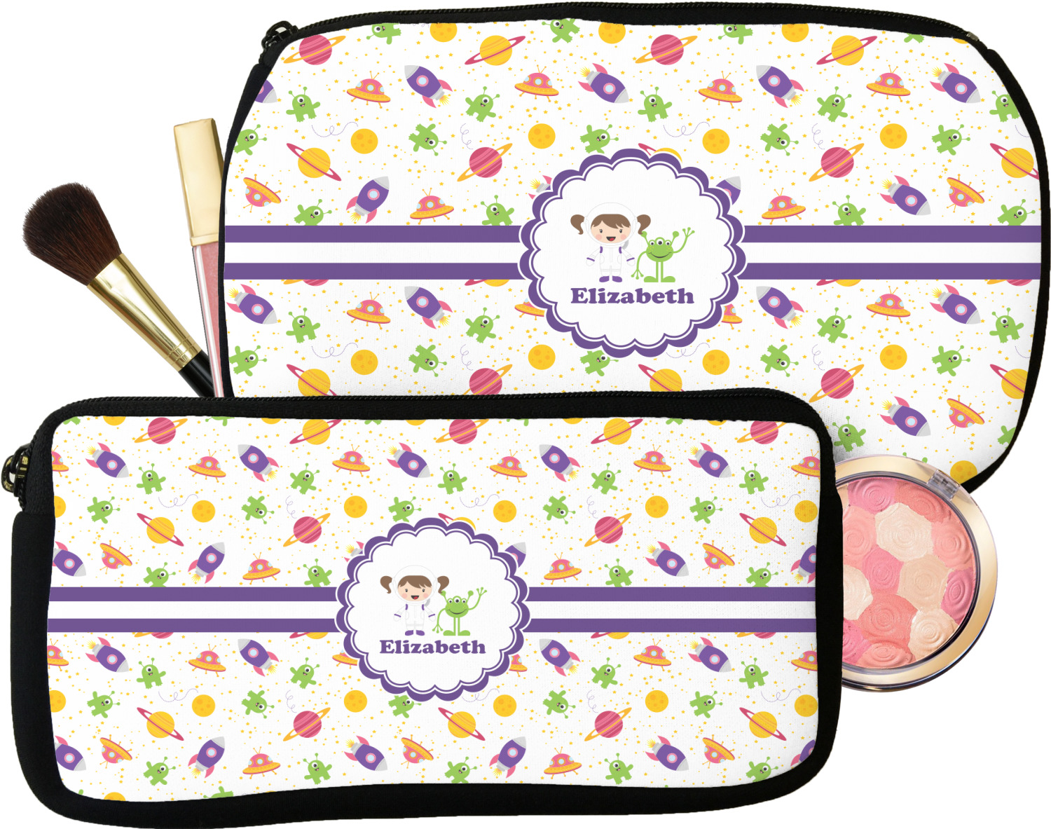 Our personalized makeup bags are available in many different designs, patterns and colors - so you are sure to find one that will love. They are made of neoprene (same material as wet-suits) and thus are water resistant, so spillages in your makeup bag will not end up all over you purse. They are customized on one side and are black on the other side and the zipper is black as well.