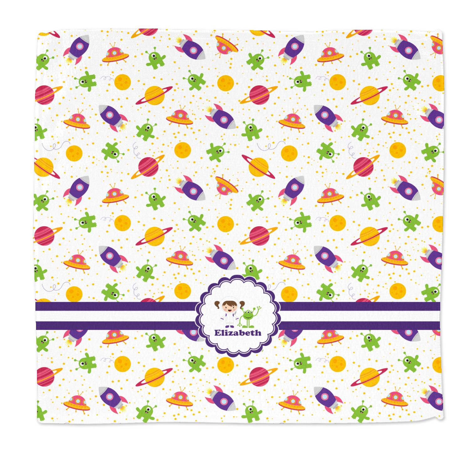Explore another galaxy with this whimsical space design. Fun colors of yellow, pink, purple, and green make this design of space exploration come alive. The design is full of little green martians, purple and pink spaceships, yellow and pink planets, and yellow stars galore.