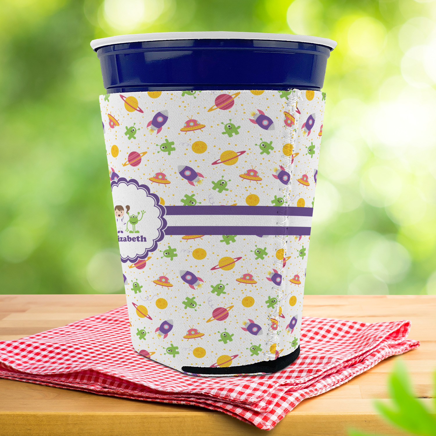 Made from neoprene with a polyester outer fabric and sewn seams, these premium quality party cup sleeves are very durable and will hold up to heavy use. They are available in 2 styles - with a bottom or just a sleeve to go around the outside of the tapered cup. The sleeve covers are about 4" tall and cover about 90% of the classic 16 oz. Solo cup.