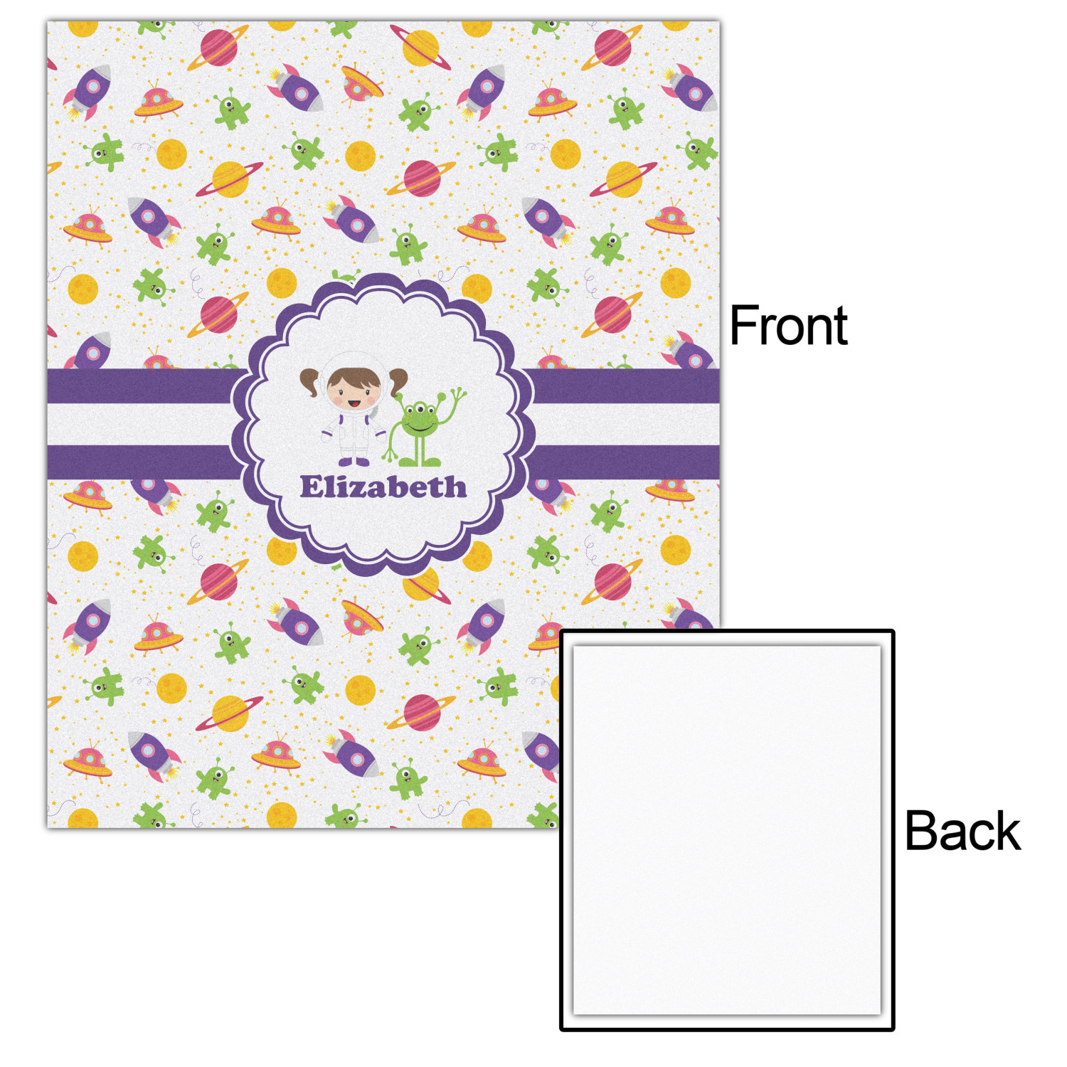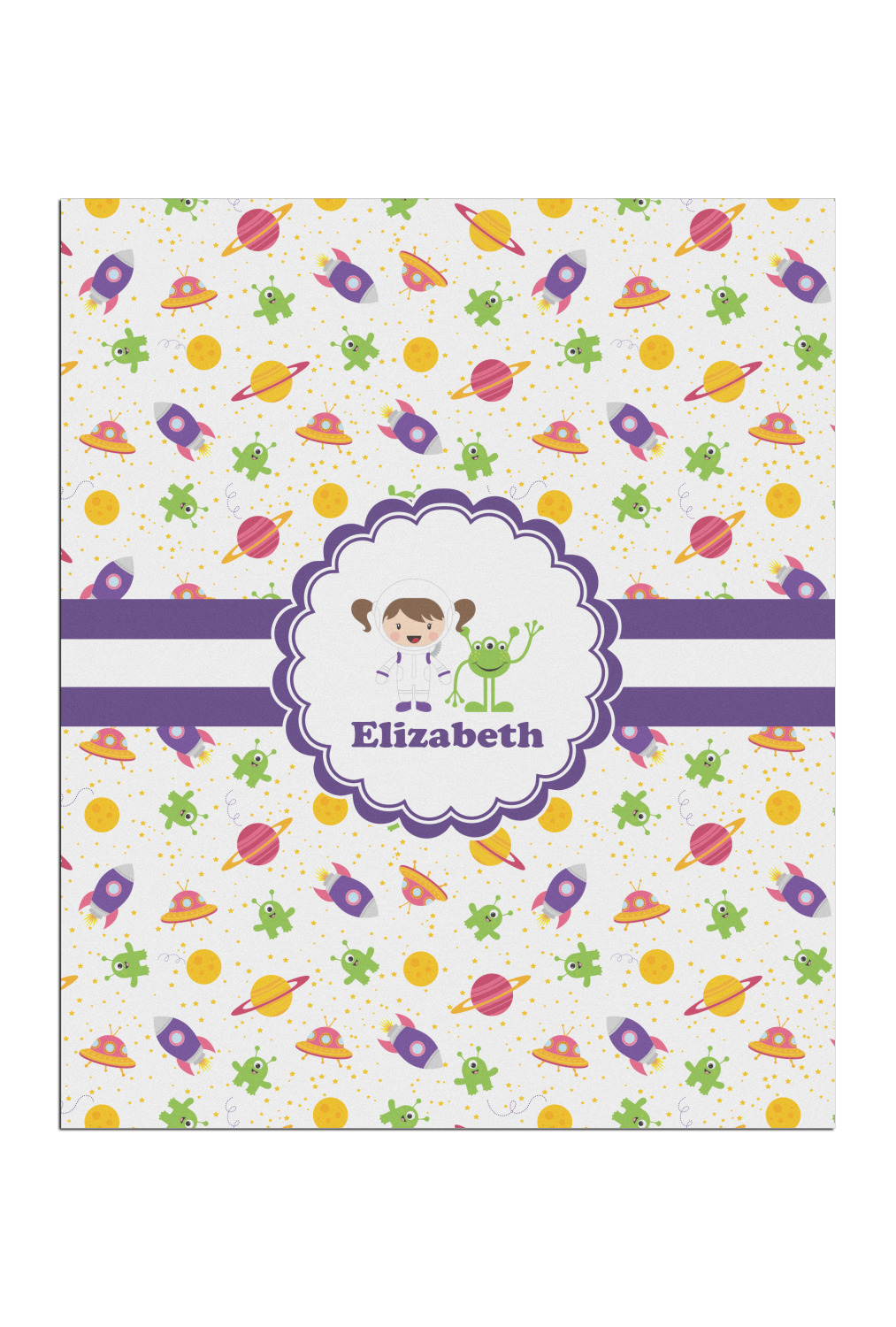 Explore another galaxy with this whimsical space design. Fun colors of yellow, pink, purple, and green make this design of space exploration come alive. The design is full of little green martians, purple and pink spaceships, yellow and pink planets, and yellow stars galore.