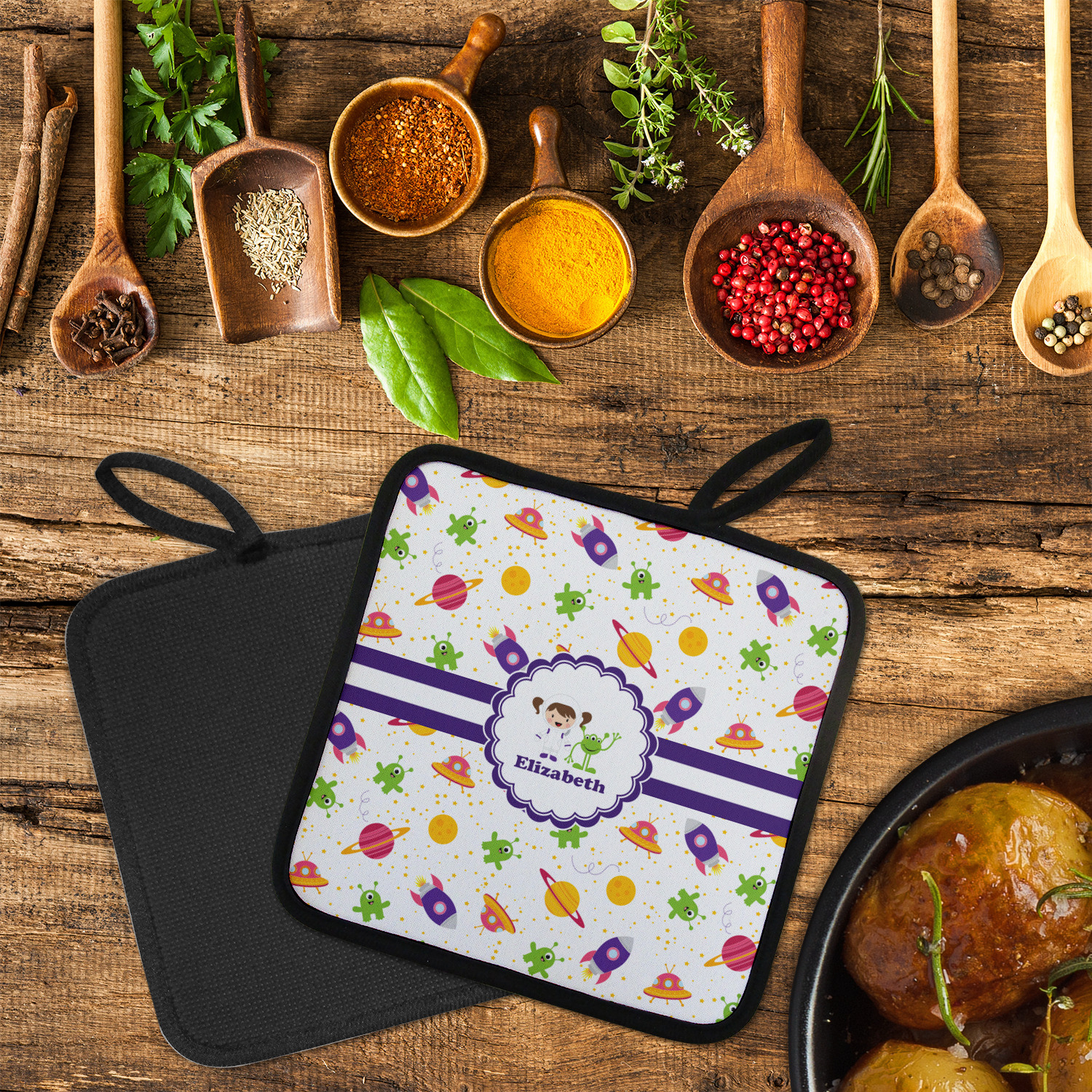 Our personalized pot holders feature a neoprene front that displays your personalization in vibrant colors. The backing of the hot pot holder is rubberized; the textured backing allows you to have a great grip when using this custom pot holder. The two materials are joined with a sleek, black trim, and the holder also includes an attached loop for hanging and storage. The pot holder is approximately 8.75 inches by 8.75 inches and 0.25 inches tall, while the fabric loop is 2.5 inches long. You can purchase a kitchen pot holder by itself or as a set of 2. We also offer a set including one pot holder and one oven mitt.