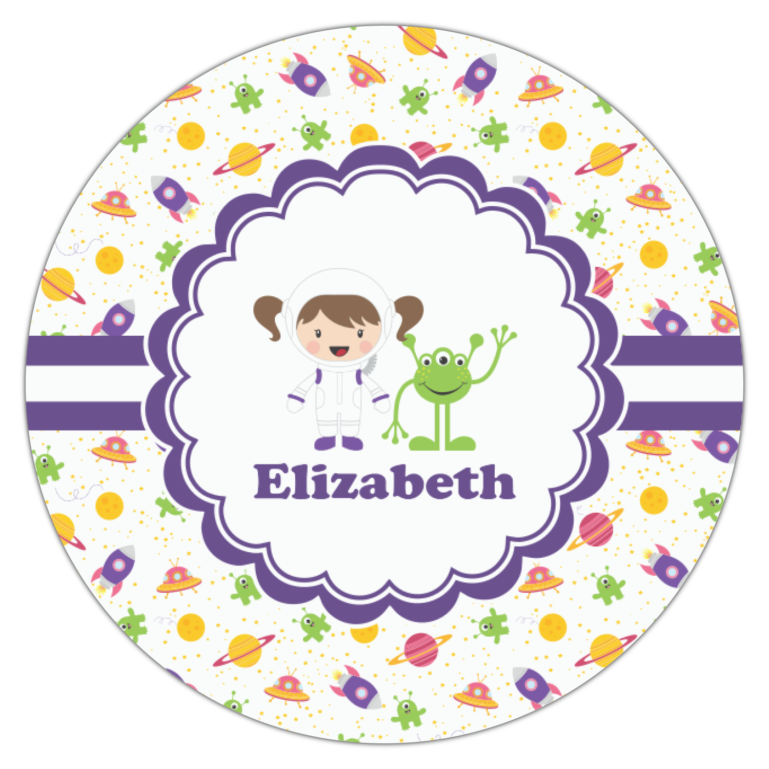 Explore another galaxy with this whimsical space design. Fun colors of yellow, pink, purple, and green make this design of space exploration come alive. The design is full of little green martians, purple and pink spaceships, yellow and pink planets, and yellow stars galore.