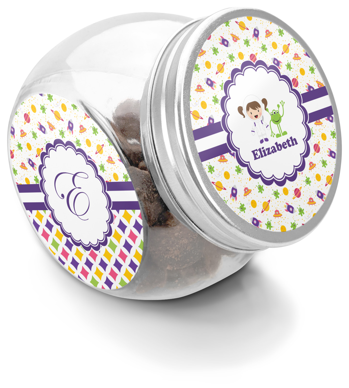 This treat jar is an excellent way to store treats for your favorite canine or feline. Moreover, their delicate, classy appearance makes them a tasteful addition to your countertop's décor. Crafted from clear glass, its unique construction and silver metal, screw-on lid allows for quick and easy access. Three, permanent, vinyl stickers are applied to both sides of the jar and lid, presenting your personalized design. The base of this glass, dog treat jar is 3.4" x 4.75", and the jar stands at 5" tall. Though on the smaller side, this jar is best suited for smaller treats or training treats.