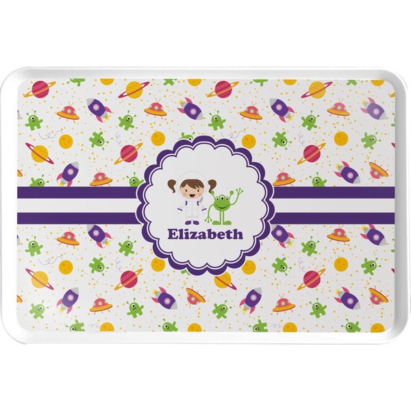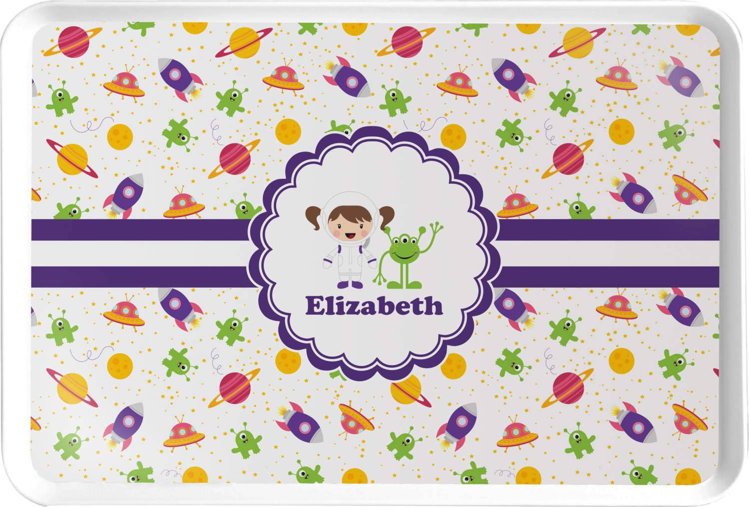 Made from a heavy melamine, these decorative trays are break resistant and are BPA free. At 14" x 9.25", these serving dishes are spacious enough to accommodate several drinks, bowls, or more. The tray features ridges underneath that allow for a sturdy stance upon any table or counter-top. We display your customization at the bottom of the tray's interior, while the remaining sides of the tray are a chic white.