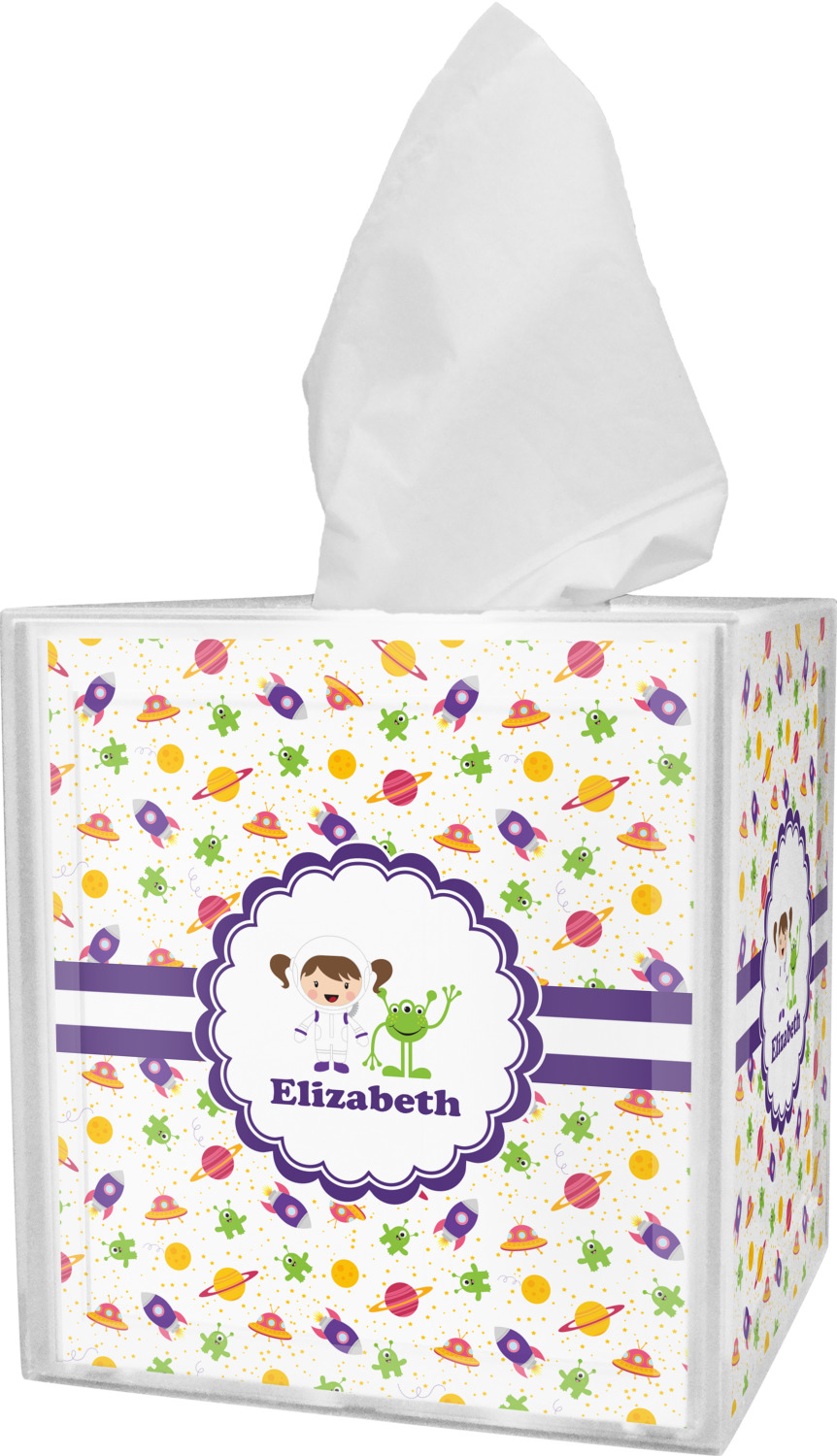 These tissue holders are built from durable acrylic and display your unique personalization on fine-quality vinyl inserts placed within the four sides and top. The box features two pieces, allowing you to easily switch out tissue boxes. On the sides, youll find ridges that ensure the top and base fit securely in place. The bottom of these tissue box holders has four, rubber, non-slip pads to prevent the box from scuffing any surface you decide to display it on. Each box can fit a standard 5 by 5-inch box of tissues.