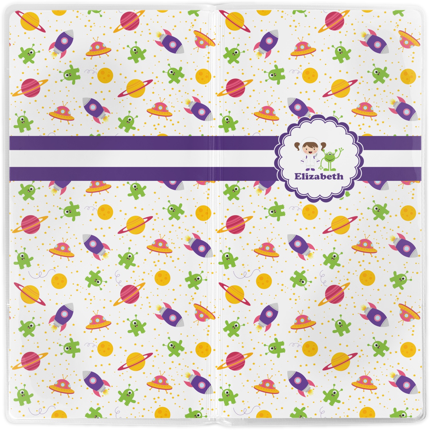 Explore another galaxy with this whimsical space design. Fun colors of yellow, pink, purple, and green make this design of space exploration come alive. The design is full of little green martians, purple and pink spaceships, yellow and pink planets, and yellow stars galore.