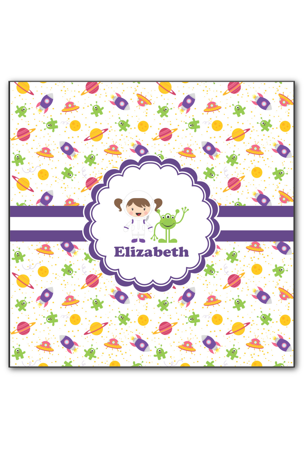 Explore another galaxy with this whimsical space design. Fun colors of yellow, pink, purple, and green make this design of space exploration come alive. The design is full of little green martians, purple and pink spaceships, yellow and pink planets, and yellow stars galore.