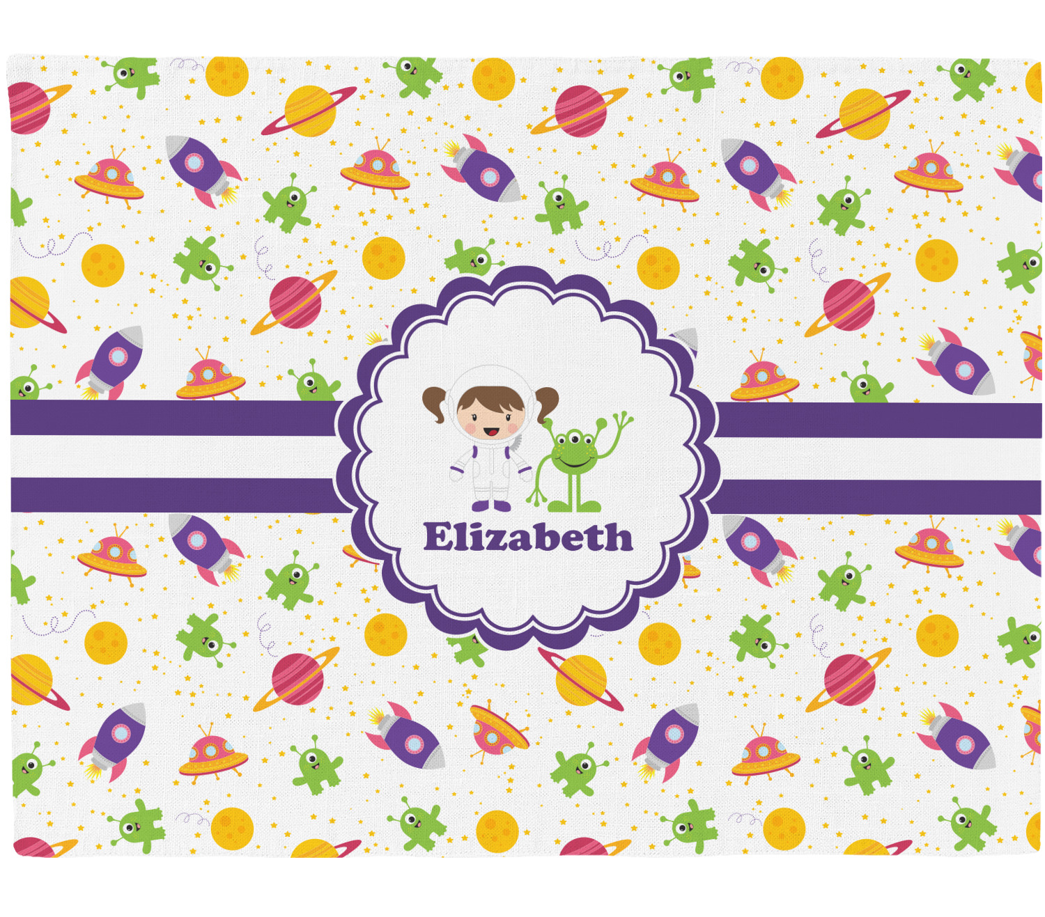 Explore another galaxy with this whimsical space design. Fun colors of yellow, pink, purple, and green make this design of space exploration come alive. The design is full of little green martians, purple and pink spaceships, yellow and pink planets, and yellow stars galore.