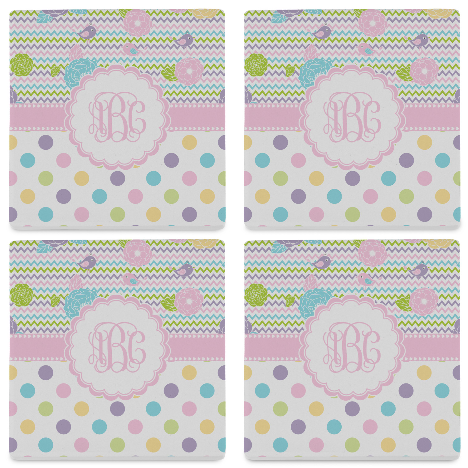 Looking for a classic girly girl design? You found it! It has everything that should please the girly girl. It has chevron, polka dots, flowers & birds along with an interlocking monogram and all done up in gorgeous pastel colors.