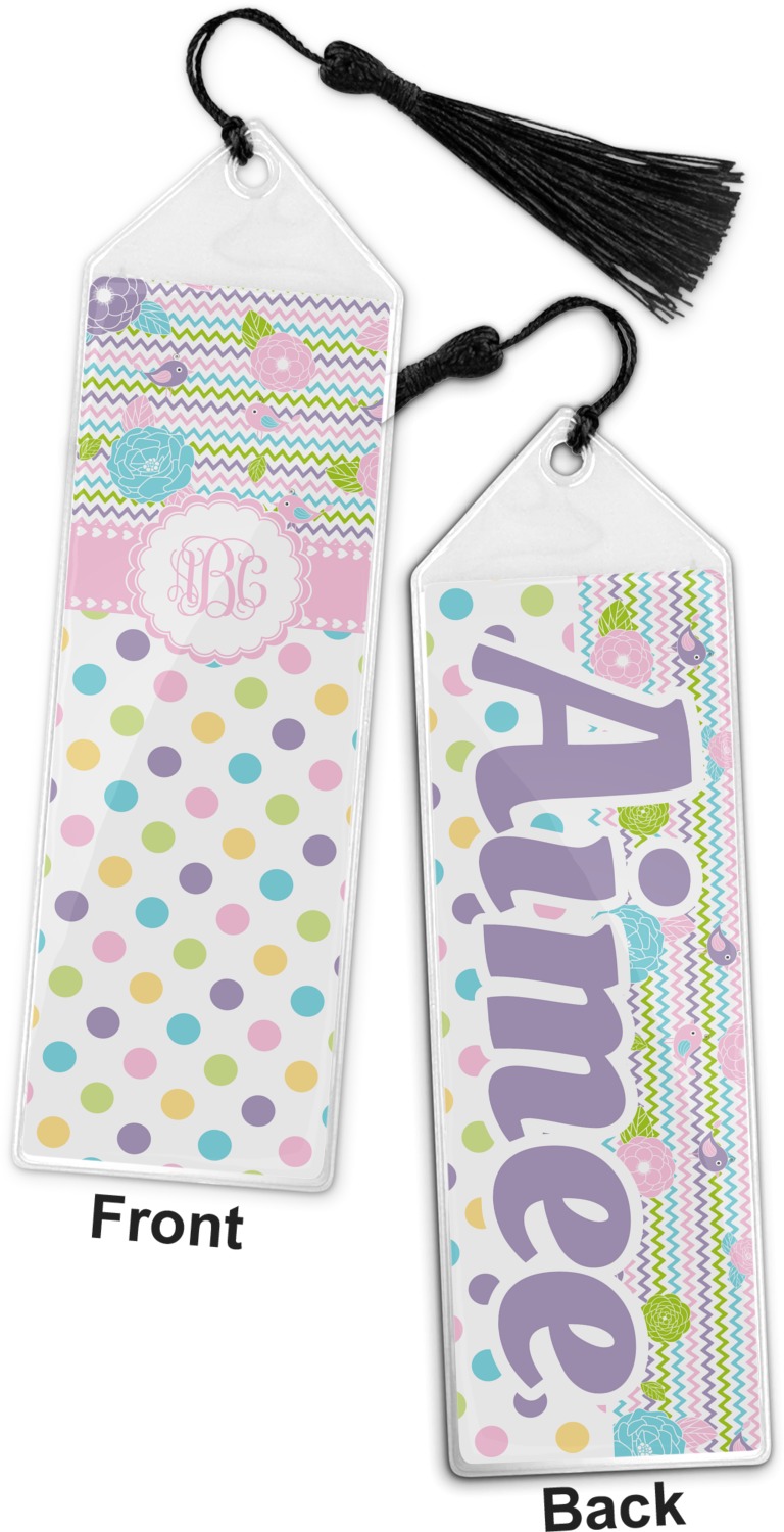 Your personalized bookmark is made of a sturdy, clear vinyl, and is approximately 7.5" x 2.25". We display your personalization on vinyl inserts that are placed on both sides. Accompanying each book marker is a black, fringe tassel that attaches to the reinforced, triangular header.