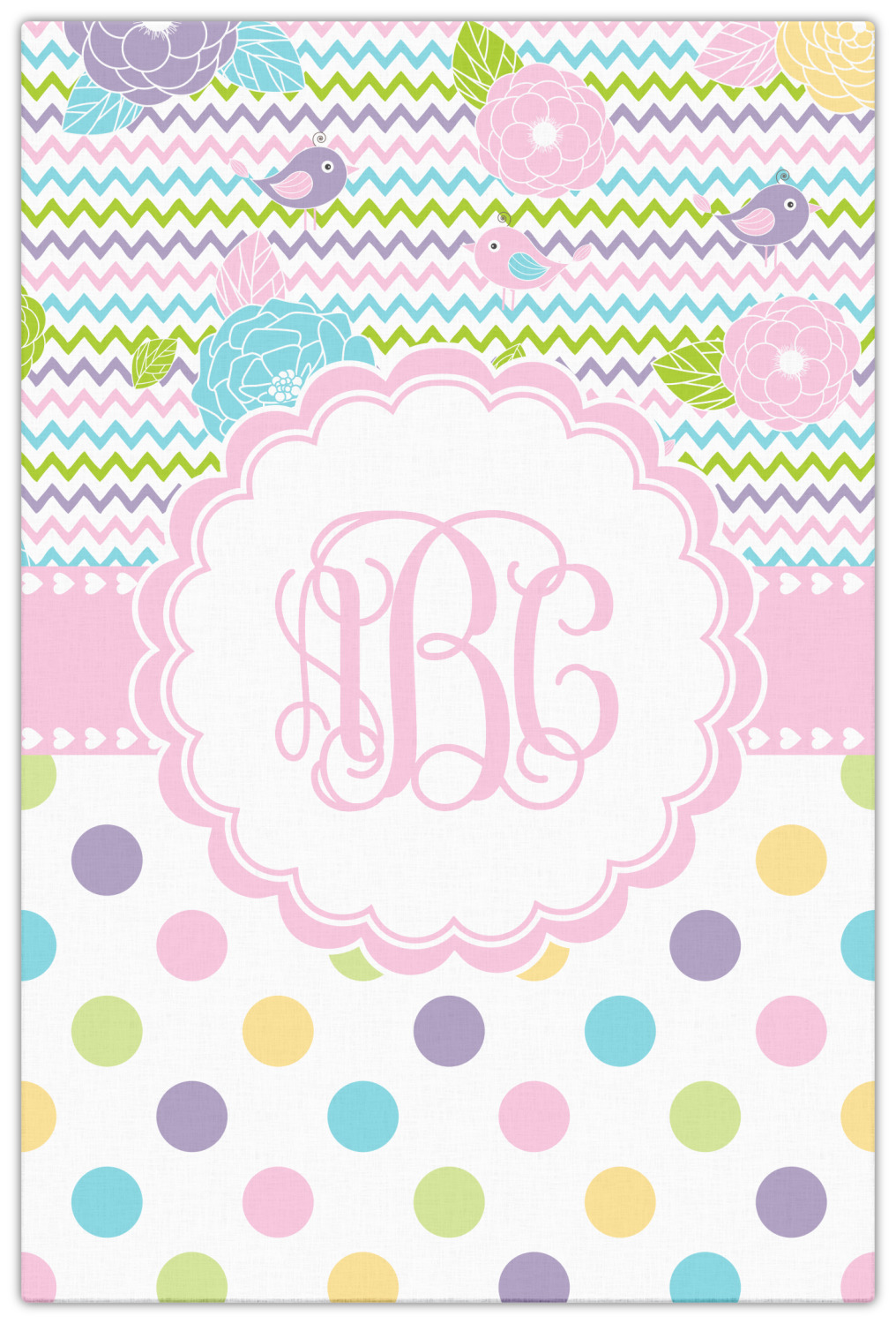 Looking for a classic girly girl design? You found it! It has everything that should please the girly girl. It has chevron, polka dots, flowers & birds along with an interlocking monogram and all done up in gorgeous pastel colors.