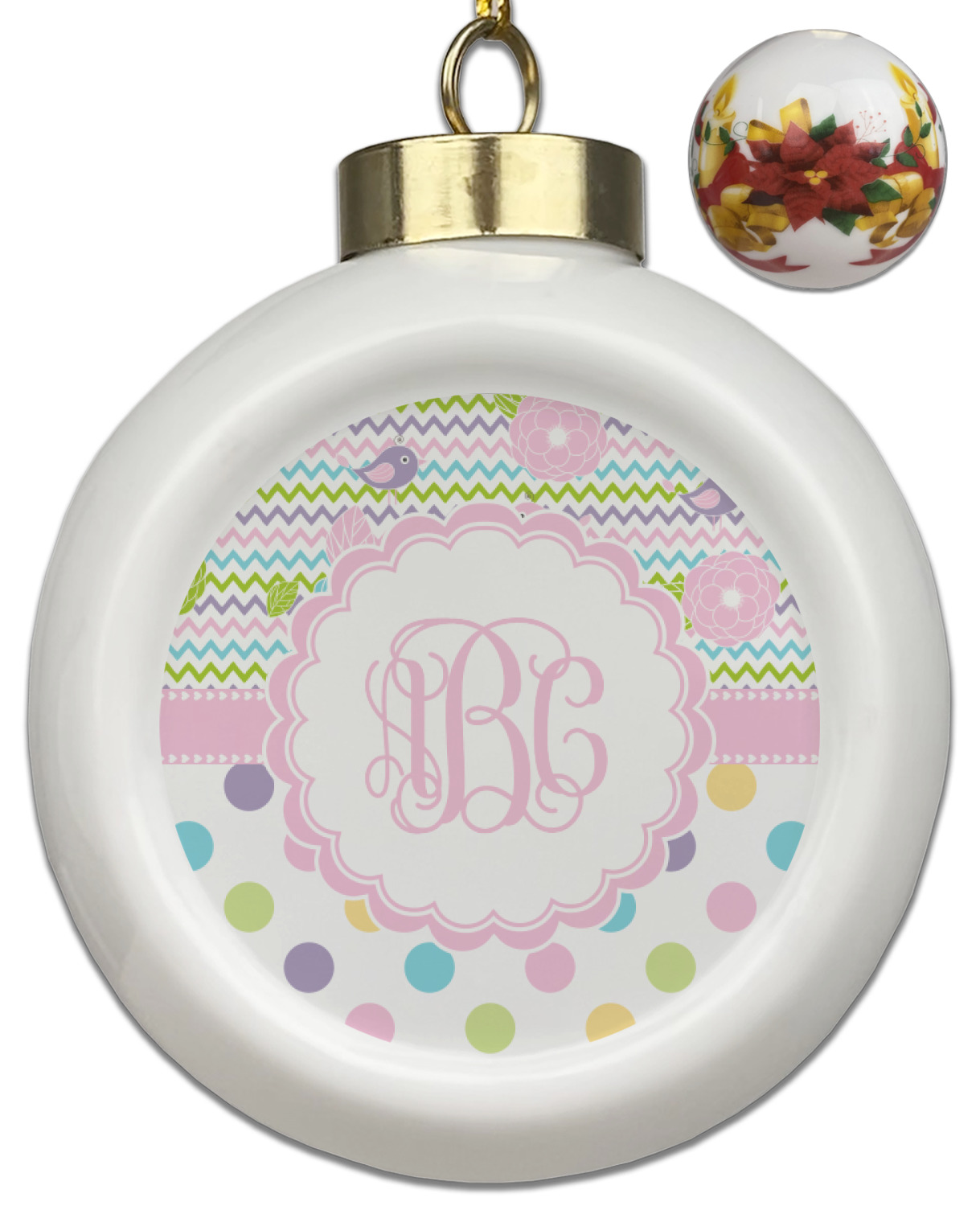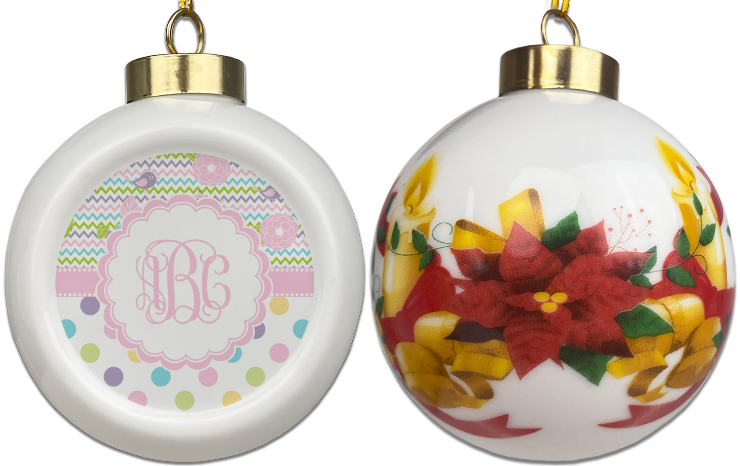 Our Christmas ornaments are a unique ceramic ball shape with a twist as it has a flat face to display your custom design! Select from one of our two design types - Christmas Tree or Poinsettia Garland - to adorn the curved back of your personal design. Each ornament measures 3H x 2.5W x 2D accompanied with a gold string accent for finishing touches to hang on your beautiful Christmas tree!