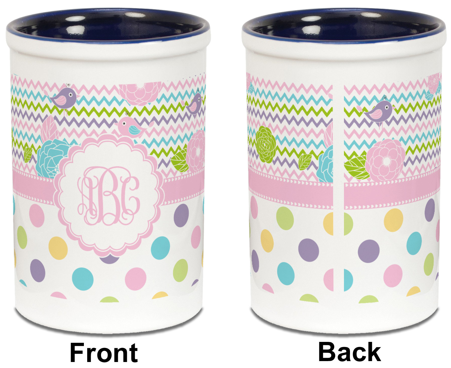Looking for a classic girly girl design? You found it! It has everything that should please the girly girl. It has chevron, polka dots, flowers & birds along with an interlocking monogram and all done up in gorgeous pastel colors.
