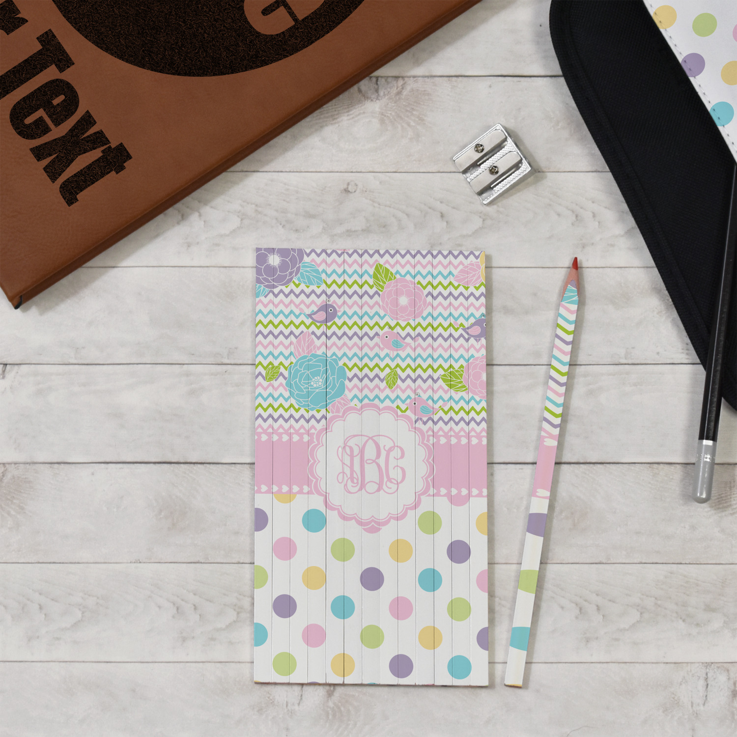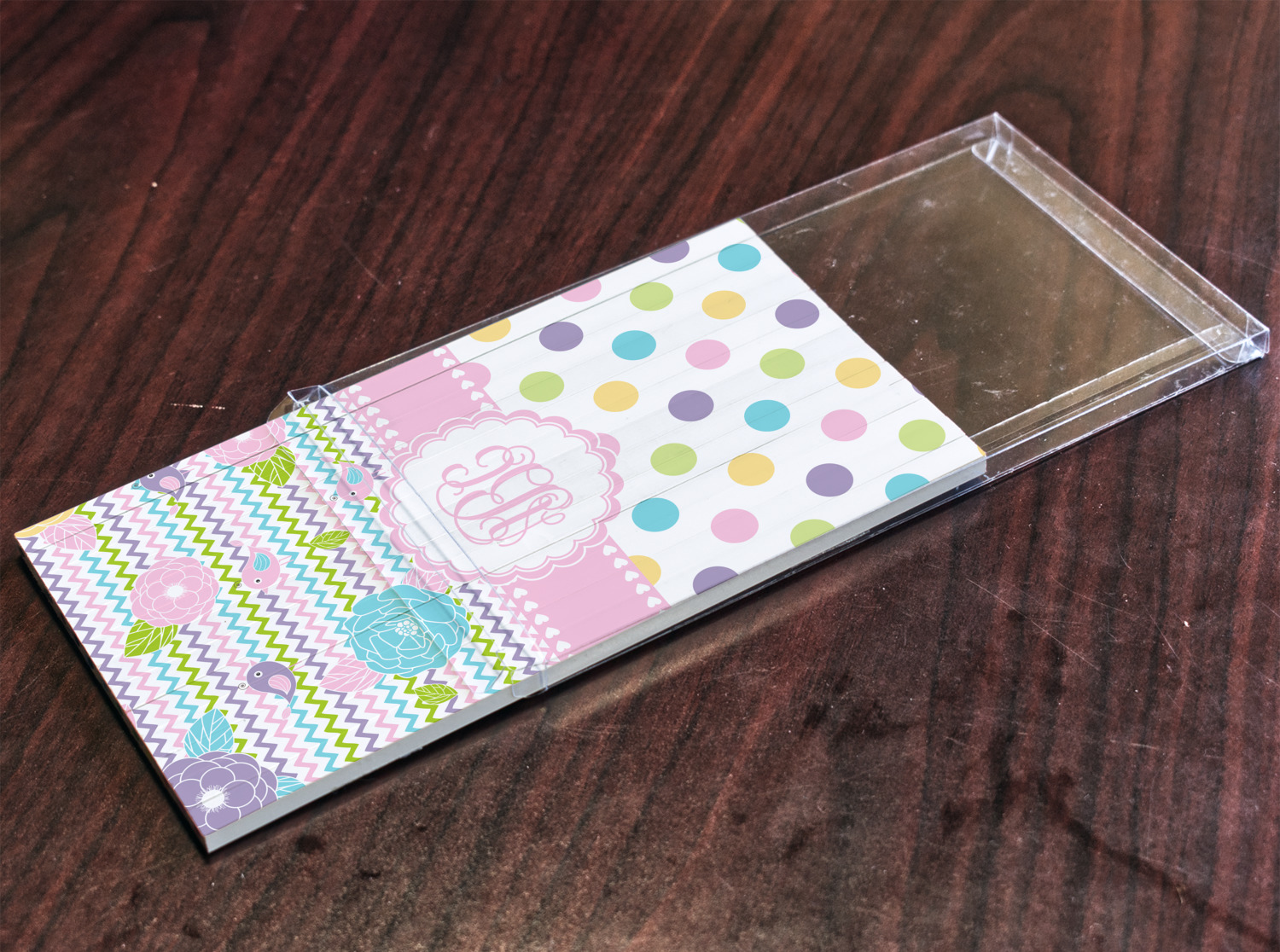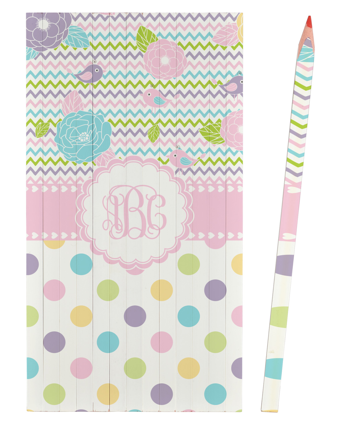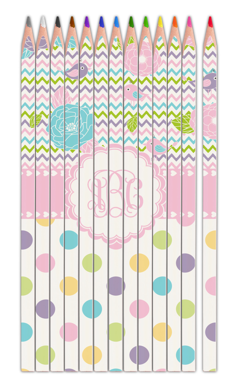 Looking for a classic girly girl design? You found it! It has everything that should please the girly girl. It has chevron, polka dots, flowers & birds along with an interlocking monogram and all done up in gorgeous pastel colors.