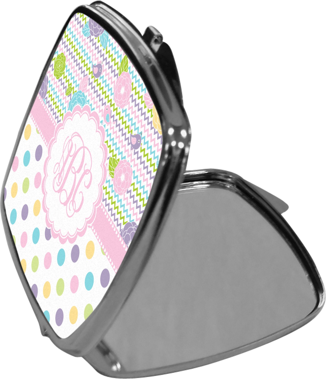 We offer many prints and patterns and many of our patterns are available in 45 different colors. You can personalized the compact mirrors with a name, a monogram or just an initial. We offer several different label, ribbon and font choices. Our customization system lets you create your very own custom & unique product and it lets you preview it before you purchase.