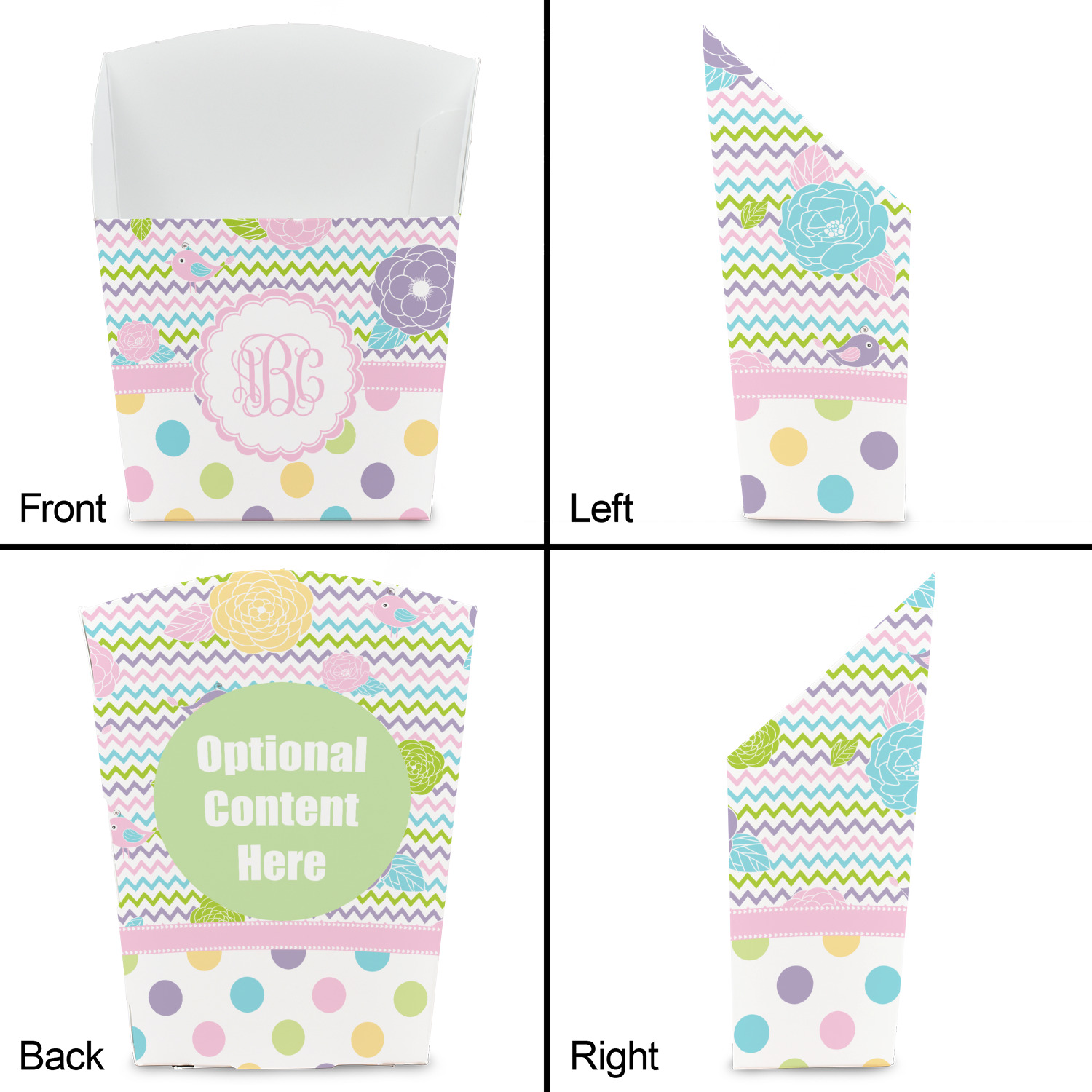 These favor boxes are printed in full color on quality cardstock - so coordinating the french fry favor boxes to match your event's themes or colors should be a breeze. You can upload your own design including artwork, logos or photos