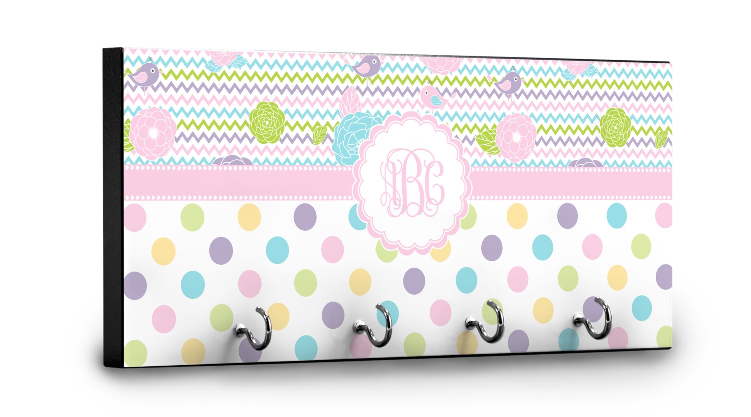 Looking for a classic girly girl design? You found it! It has everything that should please the girly girl. It has chevron, polka dots, flowers & birds along with an interlocking monogram and all done up in gorgeous pastel colors.