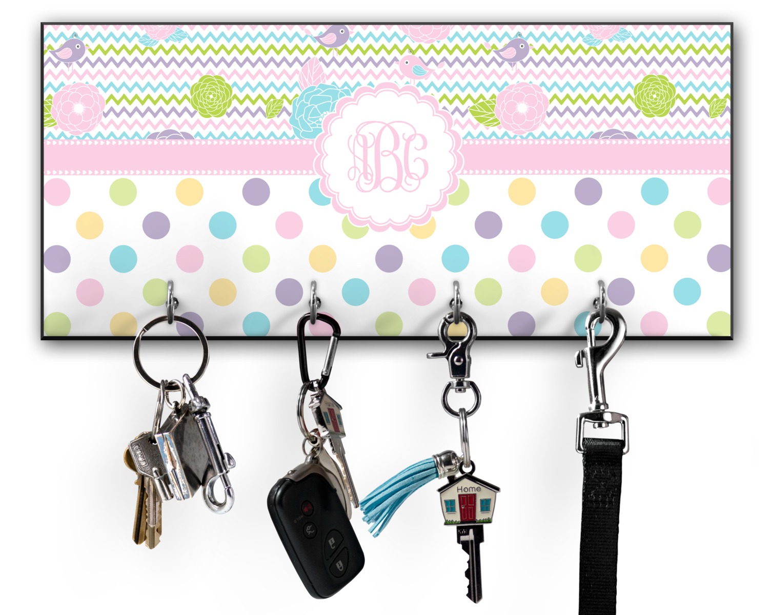 This 11" x 5" key hanger is made of sturdy wood and has four metal hooks lining the bottom. This is the perfect size for a family with several drivers. Not only can you hang keys on it though, but pet leashes and other small items. The board is black on the sides and back and is printed with the design of your choice on the front.