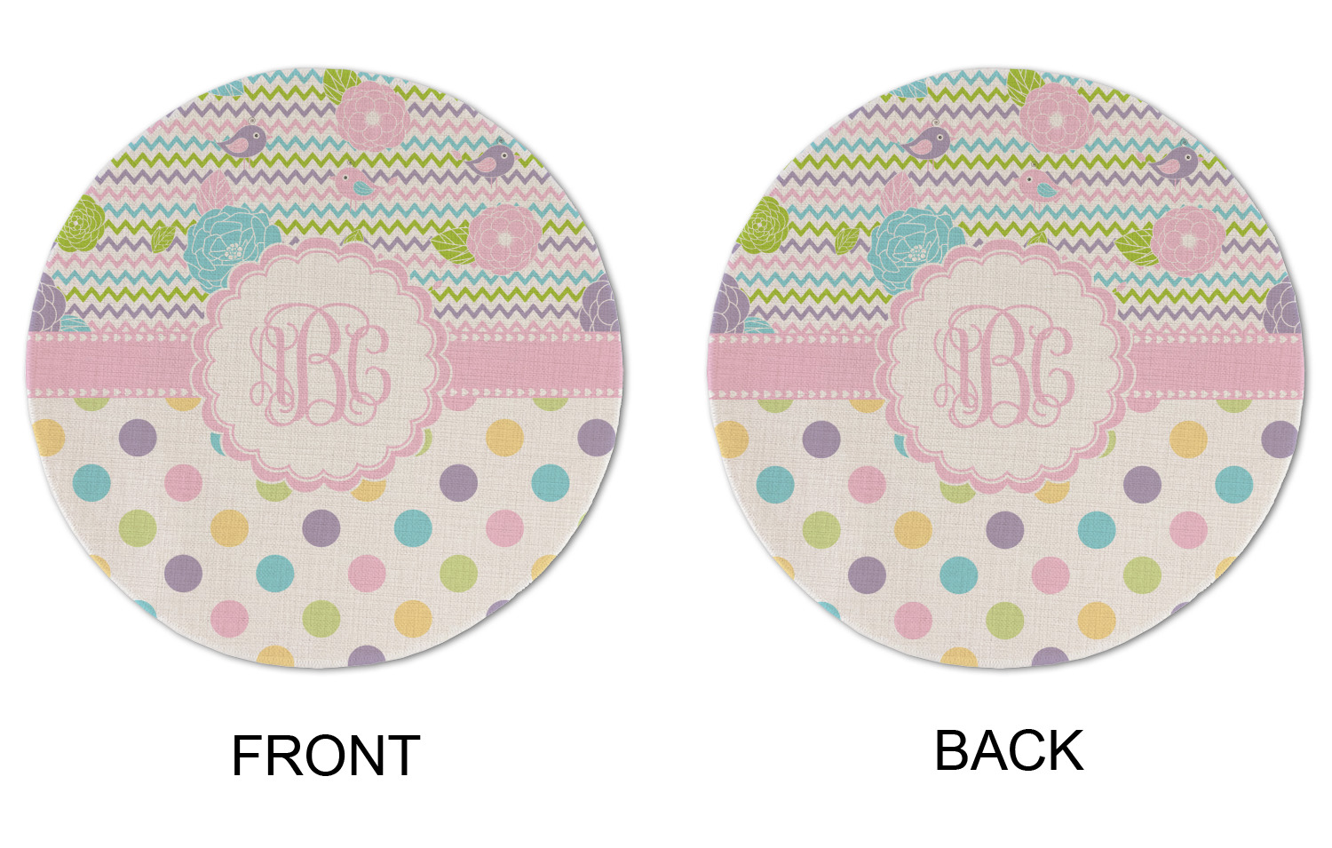 Looking for a classic girly girl design? You found it! It has everything that should please the girly girl. It has chevron, polka dots, flowers & birds along with an interlocking monogram and all done up in gorgeous pastel colors.