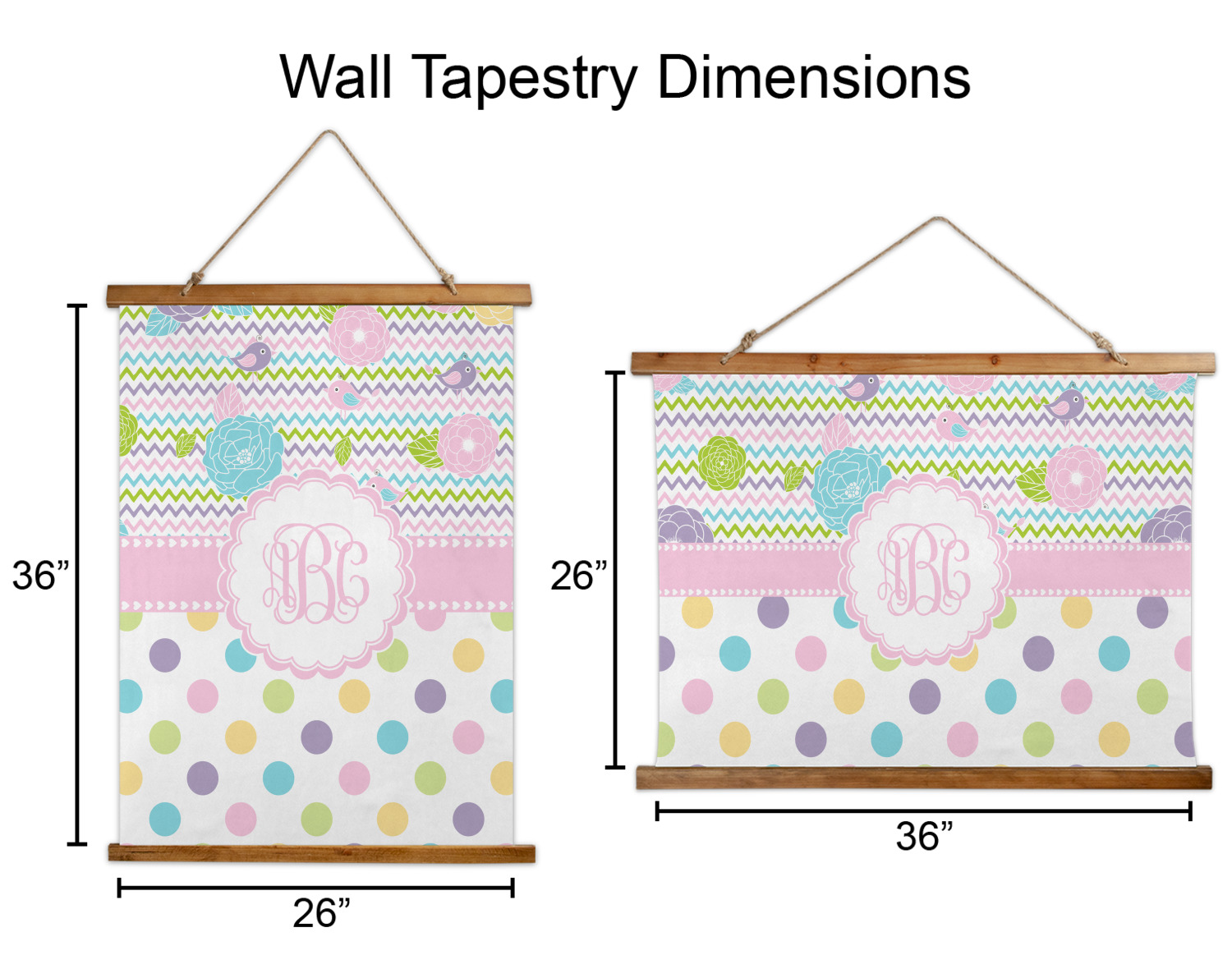 Made in two different orientations - portrait or landscape - both are 26" x 36". Your design is printed on a high quality polyester fabric with hemmed edges. The wood on the top and bottom of the tapestry is 1.25" tall and 0.25" thick and there are two pieces on top and bottom which sandwich the fabric.