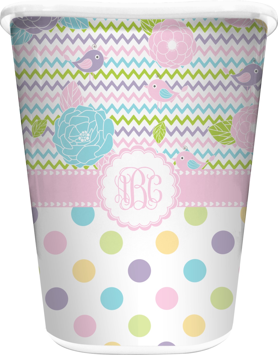 Looking for a classic girly girl design? You found it! It has everything that should please the girly girl. It has chevron, polka dots, flowers & birds along with an interlocking monogram and all done up in gorgeous pastel colors.