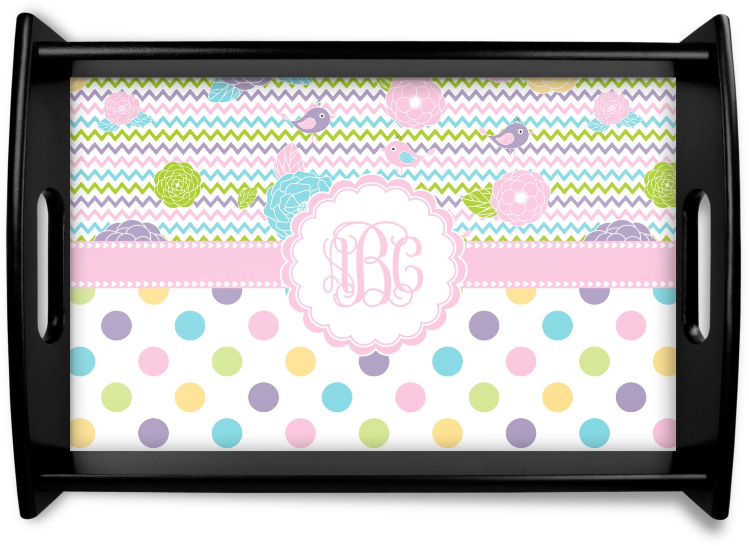 Looking for a classic girly girl design? You found it! It has everything that should please the girly girl. It has chevron, polka dots, flowers & birds along with an interlocking monogram and all done up in gorgeous pastel colors.