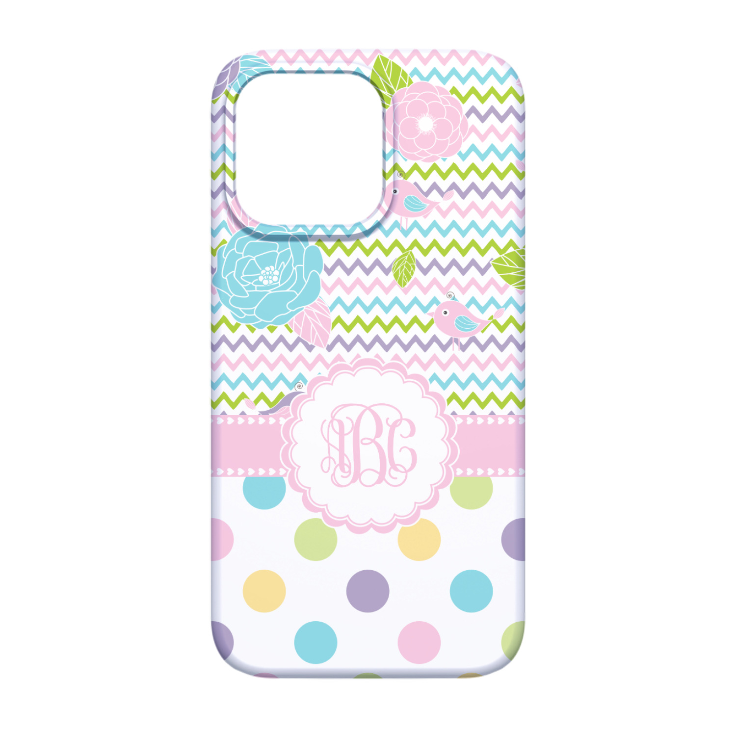 Looking for a classic girly girl design? You found it! It has everything that should please the girly girl. It has chevron, polka dots, flowers & birds along with an interlocking monogram and all done up in gorgeous pastel colors.