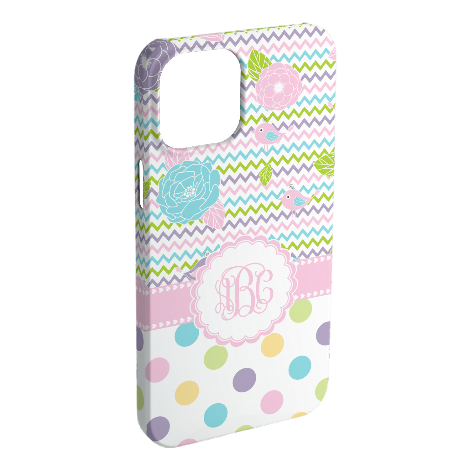 Looking for a classic girly girl design? You found it! It has everything that should please the girly girl. It has chevron, polka dots, flowers & birds along with an interlocking monogram and all done up in gorgeous pastel colors.