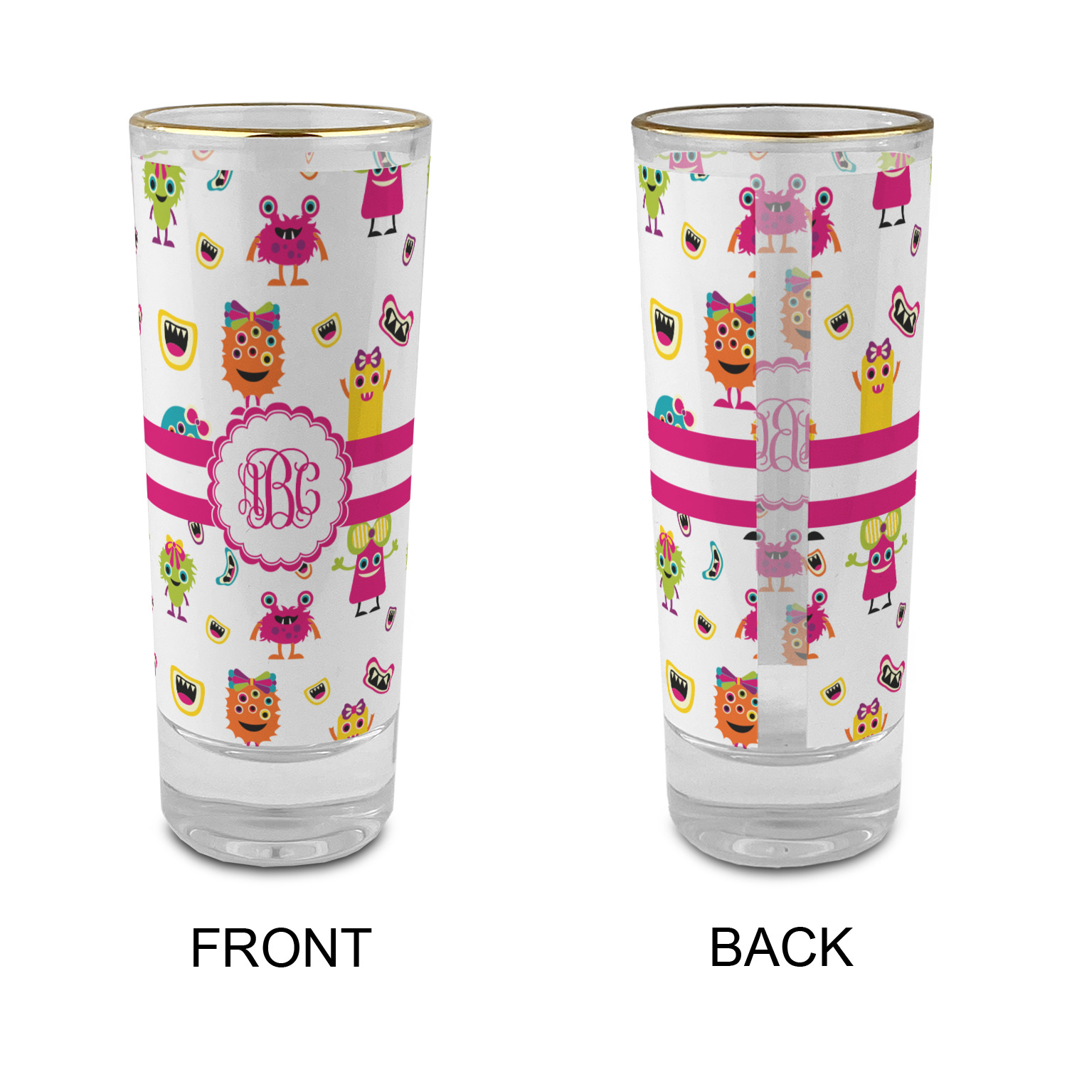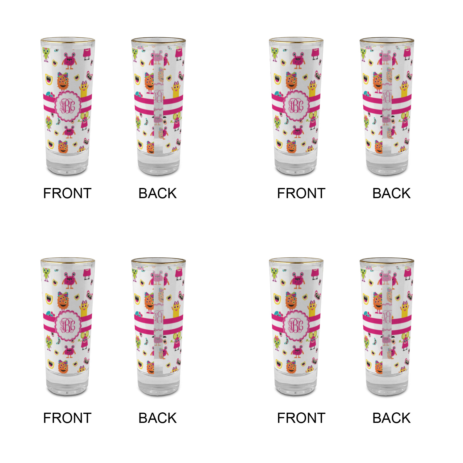 These glass shooter glasses are printed in full color with the design of your choice. These are a tall shooter 2 oz size and stand 4" tall. The print is a full wrap design to boldly display your personalization.