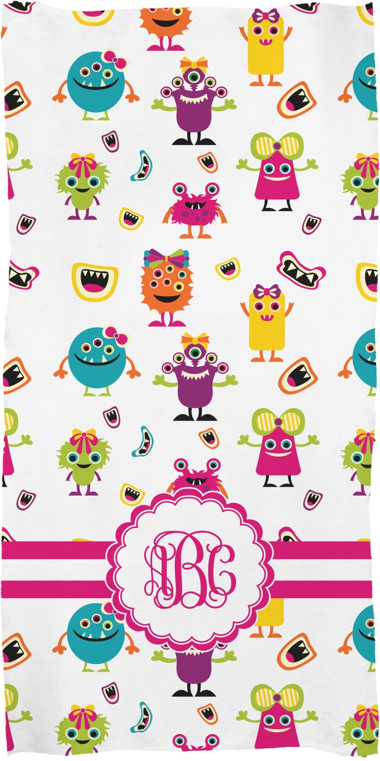 These customized bath towels are slightly larger than your standard towel and are the ideal size for wrapping around your body. They measure approximately 60" x 30". Your customization is displayed across the entire front face of the towel, while the back is white.
