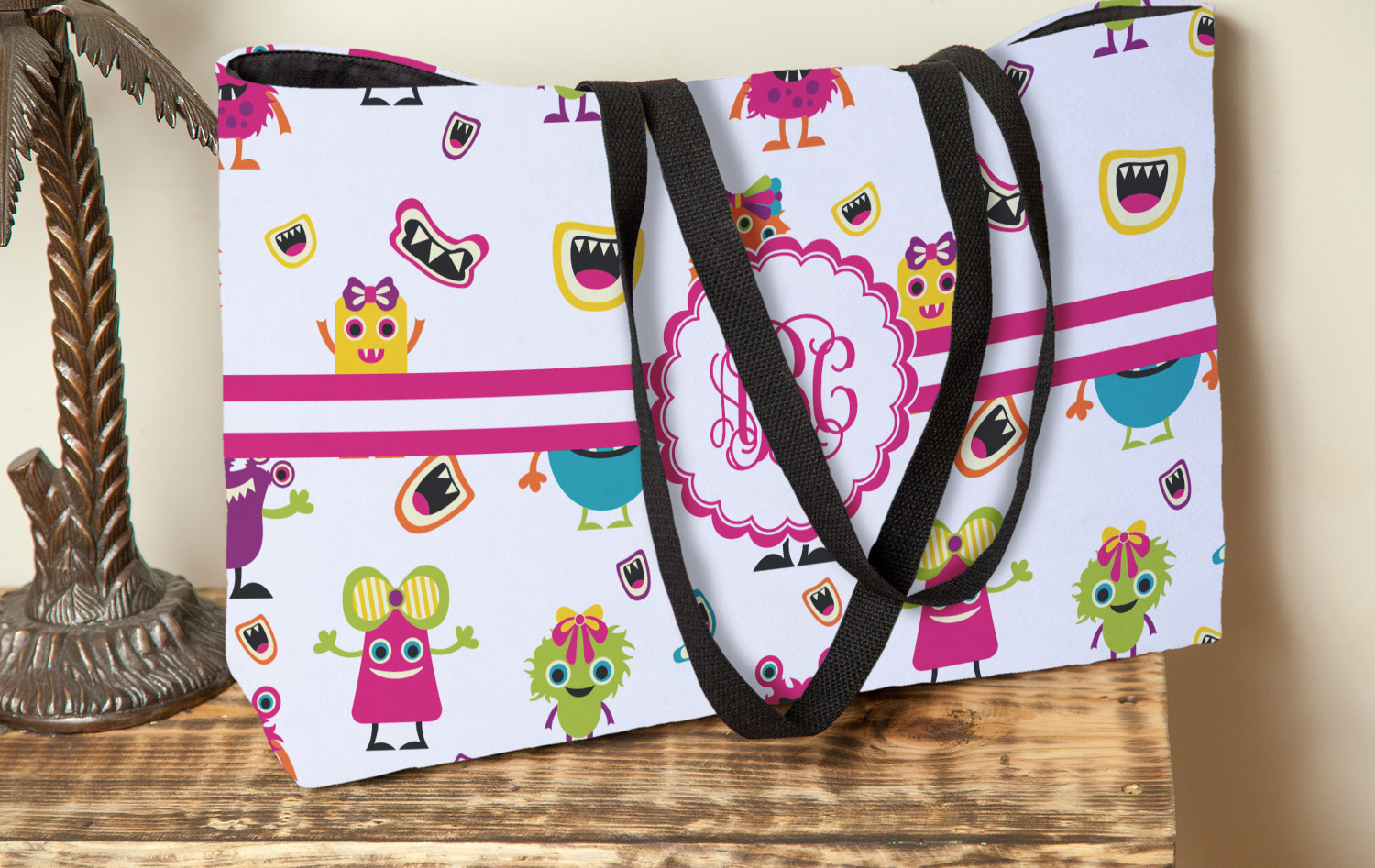 These beach totes are handmade here in the USA. Fabric is printed with your design. The tote is then sewn from the fabric pieces, lining and handles added.