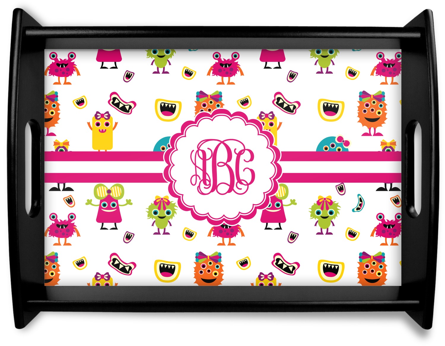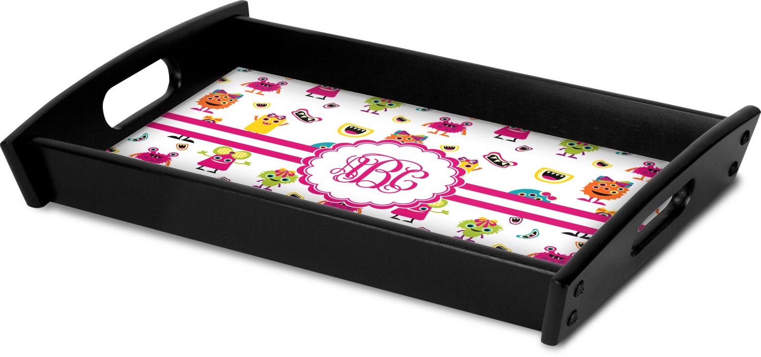 This serving tray with handles features square edges and two rounded sides, creating a very modern look. Each side is fabricated from a beautifully cut, natural wood. The bottom of the interior of the tray displays your customized design in bright, vibrant color. The tray is sold in both a black color and a natural wood look. Each variation of the wood serving tray has two sizes: Small, which is 14" x 10" x 2.25", and Large, which is 19.5" x 13.5" x 2.75".