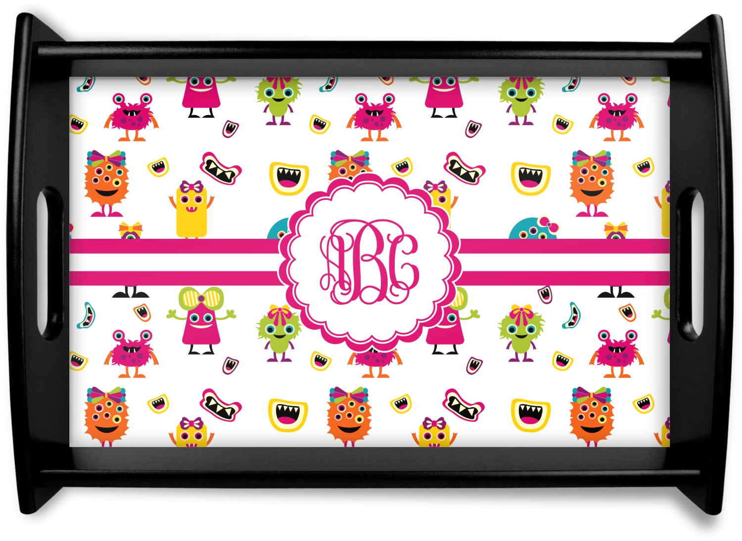 This serving tray with handles features square edges and two rounded sides, creating a very modern look. Each side is fabricated from a beautifully cut, natural wood. The bottom of the interior of the tray displays your customized design in bright, vibrant color. The tray is sold in both a black color and a natural wood look. Each variation of the wood serving tray has two sizes: Small, which is 14" x 10" x 2.25", and Large, which is 19.5" x 13.5" x 2.75".