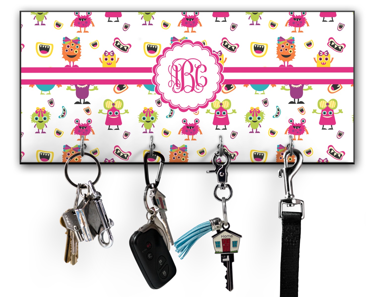 This 11" x 5" key hanger is made of sturdy wood and has four metal hooks lining the bottom. This is the perfect size for a family with several drivers. Not only can you hang keys on it though, but pet leashes and other small items. The board is black on the sides and back and is printed with the design of your choice on the front.