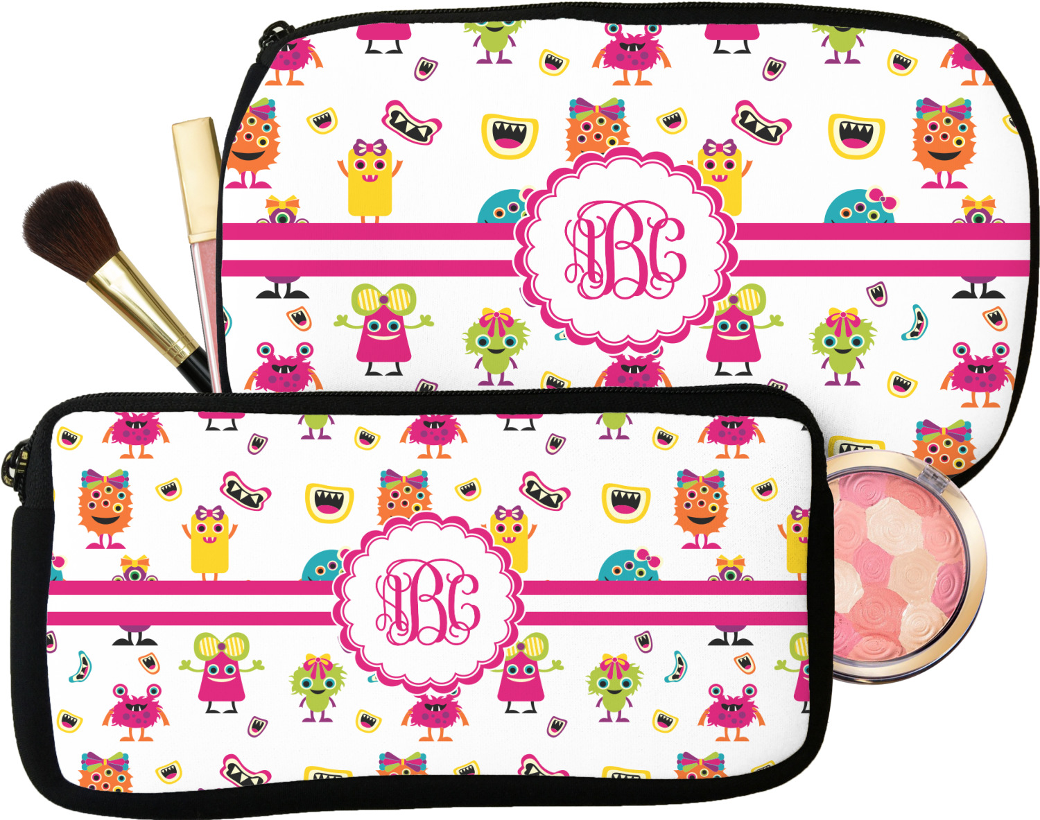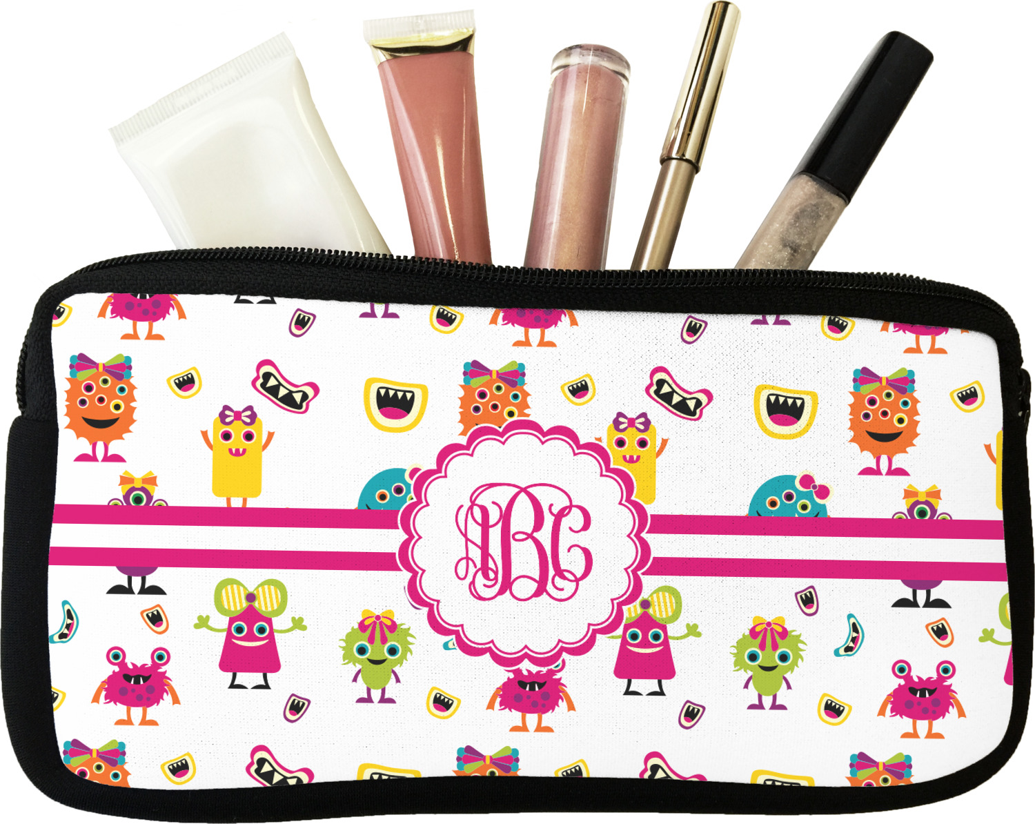 Our personalized makeup bags are available in many different designs, patterns and colors - so you are sure to find one that will love. They are made of neoprene (same material as wet-suits) and thus are water resistant, so spillages in your makeup bag will not end up all over you purse. They are customized on one side and are black on the other side and the zipper is black as well.