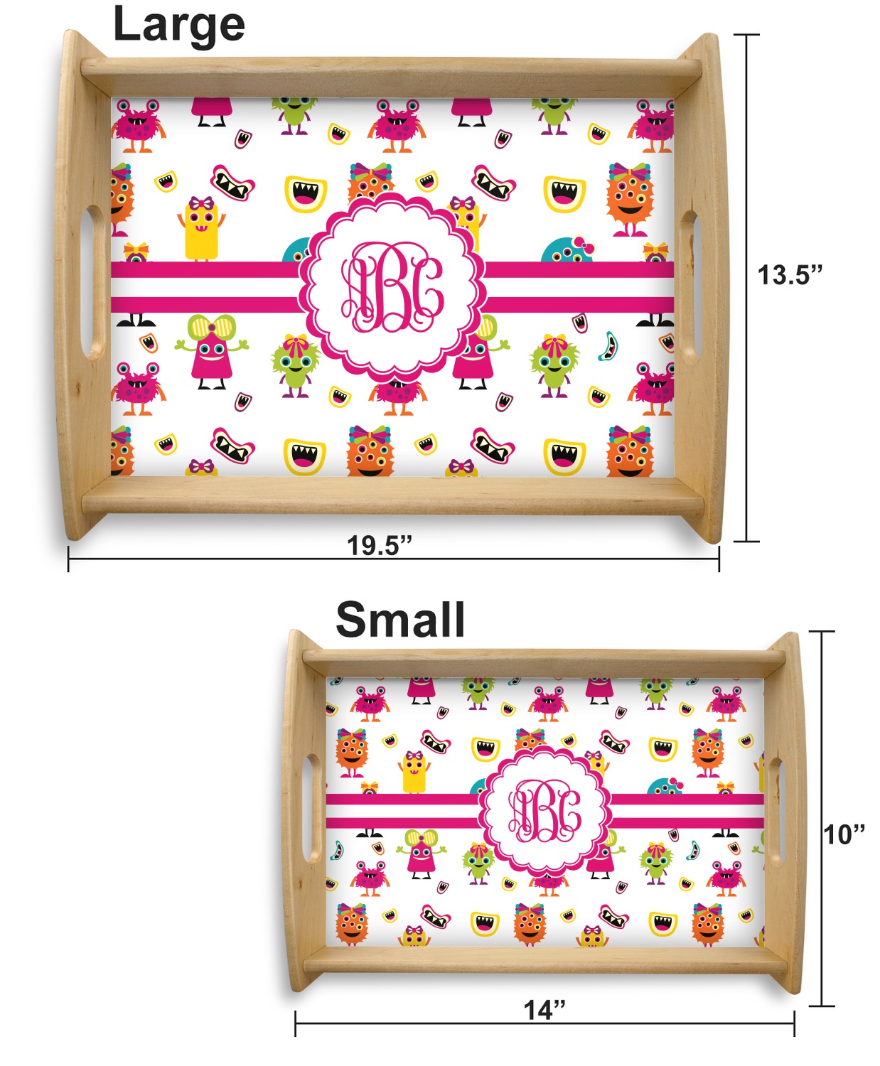 This serving tray with handles features square edges and two rounded sides, creating a very modern look. Each side is fabricated from a beautifully cut, natural wood. The bottom of the interior of the tray displays your customized design in bright, vibrant color. The tray is sold in both a black color and a natural wood look. Each variation of the wood serving tray has two sizes: Small, which is 14" x 10" x 2.25", and Large, which is 19.5" x 13.5" x 2.75".