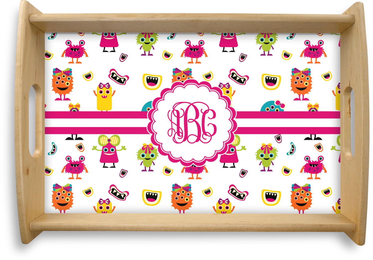 This serving tray with handles features square edges and two rounded sides, creating a very modern look. Each side is fabricated from a beautifully cut, natural wood. The bottom of the interior of the tray displays your customized design in bright, vibrant color. The tray is sold in both a black color and a natural wood look. Each variation of the wood serving tray has two sizes: Small, which is 14" x 10" x 2.25", and Large, which is 19.5" x 13.5" x 2.75".