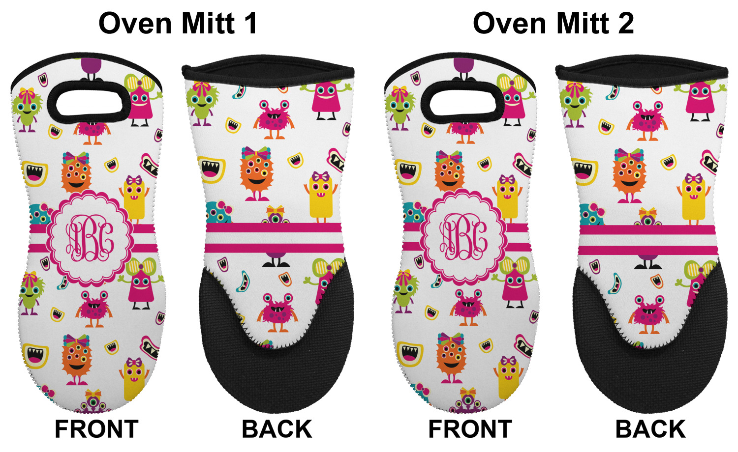 These heat resistant gloves are made entirely of a durable neoprene; the front features a softer texture, while the palm's side has a textured surface, meant to handle heat up to 500 degrees Fahrenheit. Thick, heavy duty stitching connects the two sides. A small, oval cutout appears on the front, and can be used to hang and store the mitt. Your personalization appears on the front, and the upper part of the back of the mitt. The style of these oven mitts are suitable for both the right and left hand, depending on your needs. If you need one for each hand, be sure to order two!