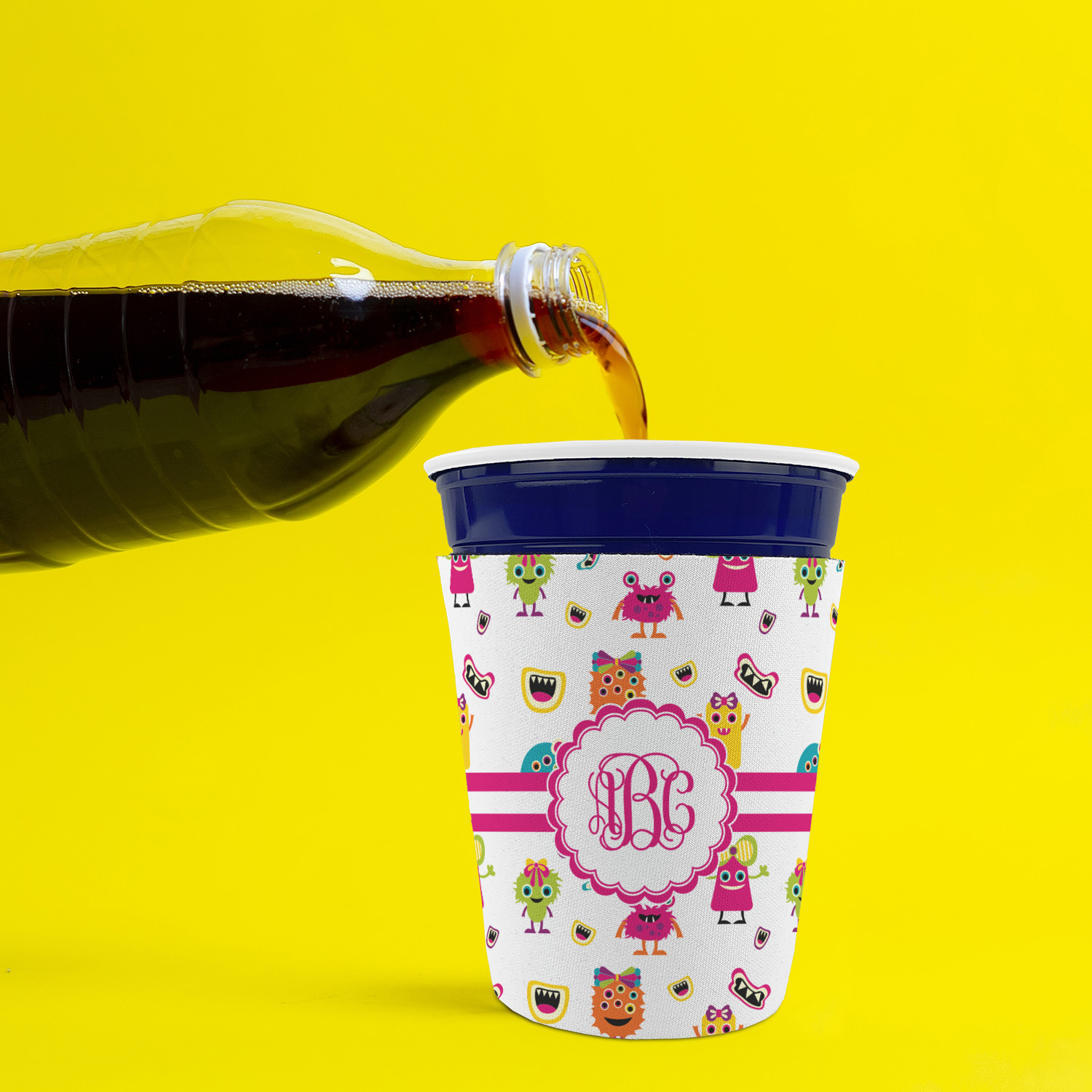 Made from neoprene with a polyester outer fabric and sewn seams, these premium quality party cup sleeves are very durable and will hold up to heavy use. They are available in 2 styles - with a bottom or just a sleeve to go around the outside of the tapered cup. The sleeve covers are about 4" tall and cover about 90% of the classic 16 oz. Solo cup.