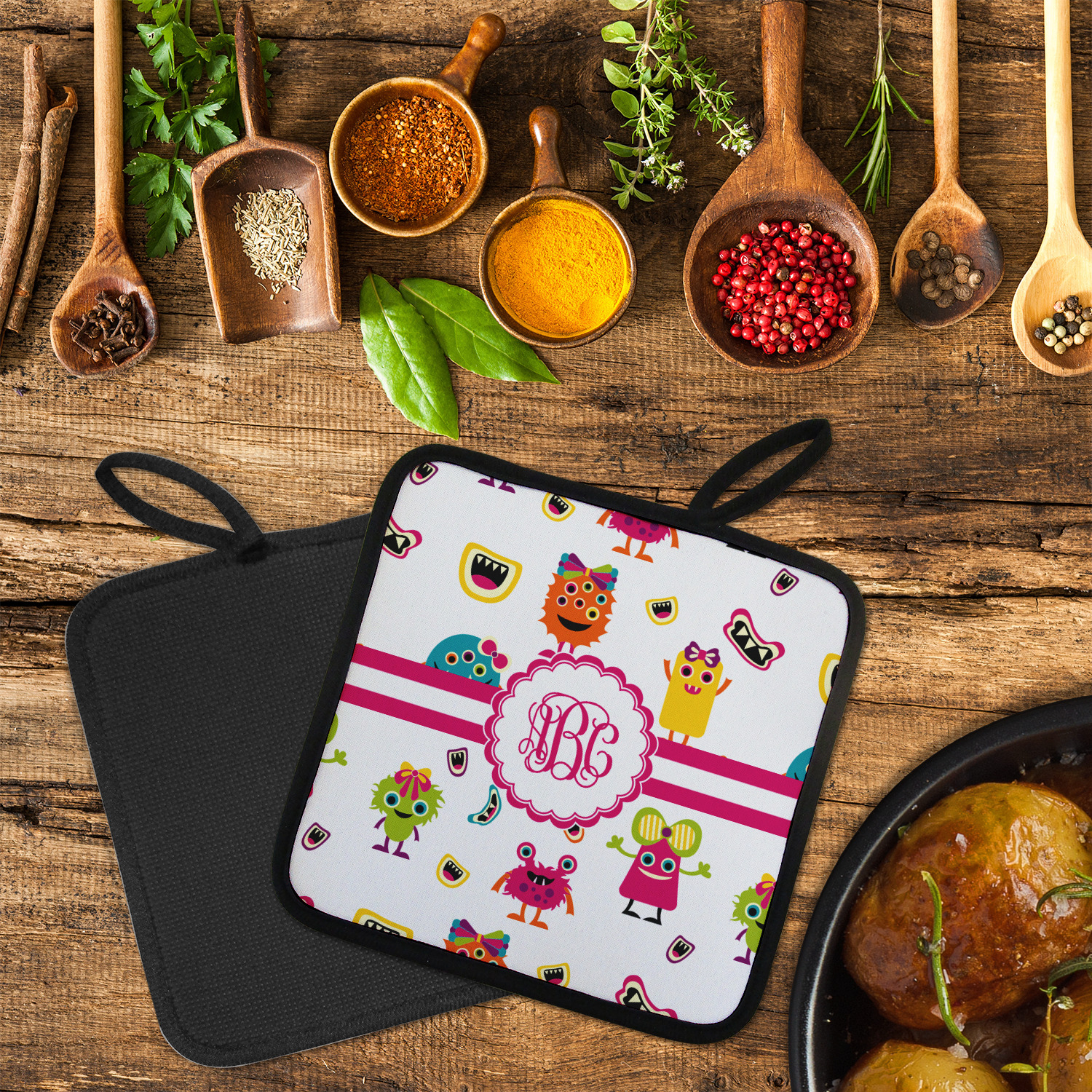 Our personalized pot holders feature a neoprene front that displays your personalization in vibrant colors. The backing of the hot pot holder is rubberized; the textured backing allows you to have a great grip when using this custom pot holder. The two materials are joined with a sleek, black trim, and the holder also includes an attached loop for hanging and storage. The pot holder is approximately 8.75 inches by 8.75 inches and 0.25 inches tall, while the fabric loop is 2.5 inches long. You can purchase a kitchen pot holder by itself or as a set of 2. We also offer a set including one pot holder and one oven mitt.