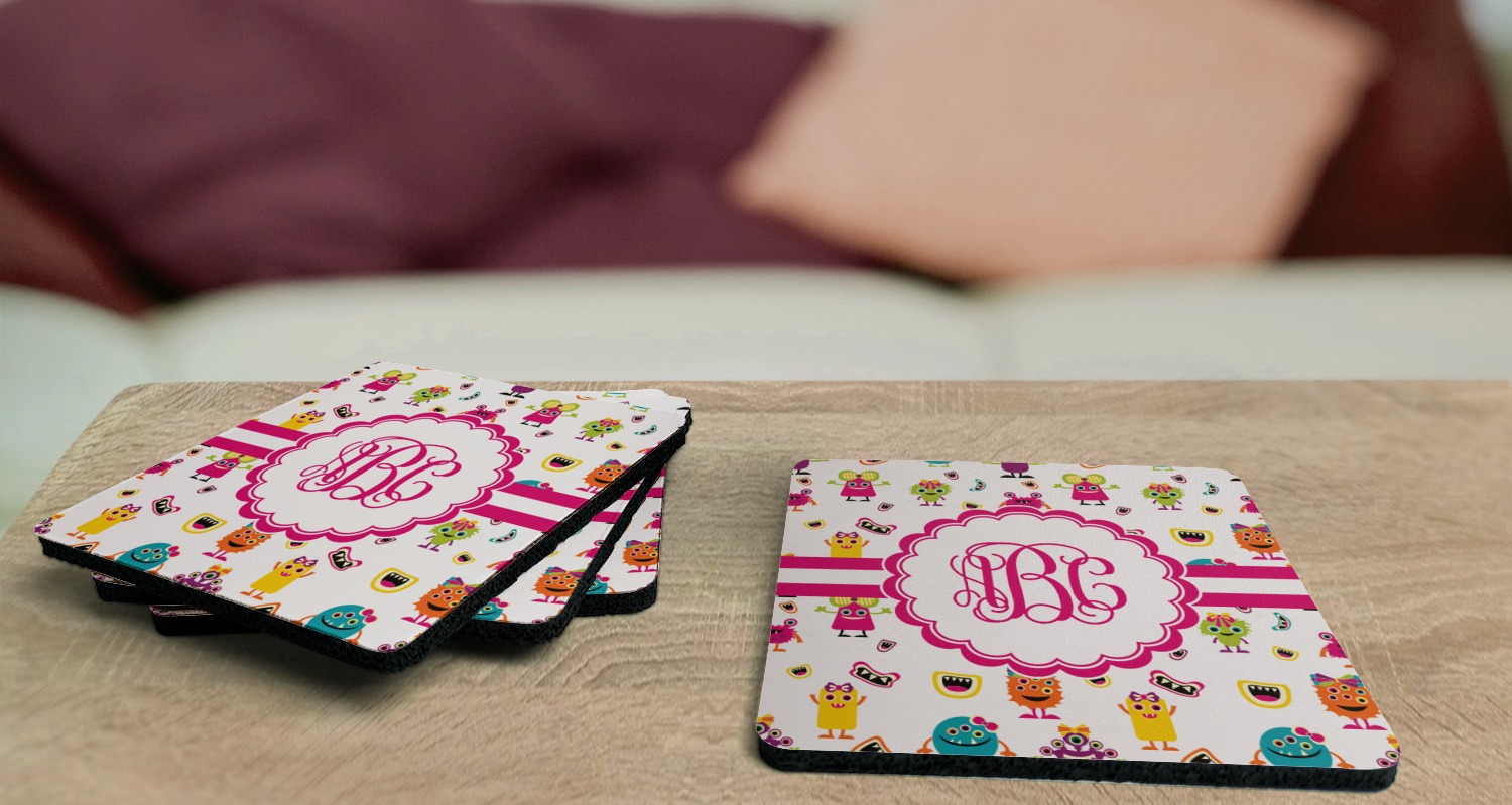 These drink coasters have a smooth, polyester top and a textured, rubber backing on its bottom. The non-slip rubber backing underneath works to keep any spills at bay. At 4 by 4 by 0.25 inches thick, these custom coasters are a suitable size for most drinkware. Your personalization is displayed atop the face of the cup coaster. We sell these rubber coasters in two different shapes: square and round. You can buy each shape as singulars or as a set of 4.